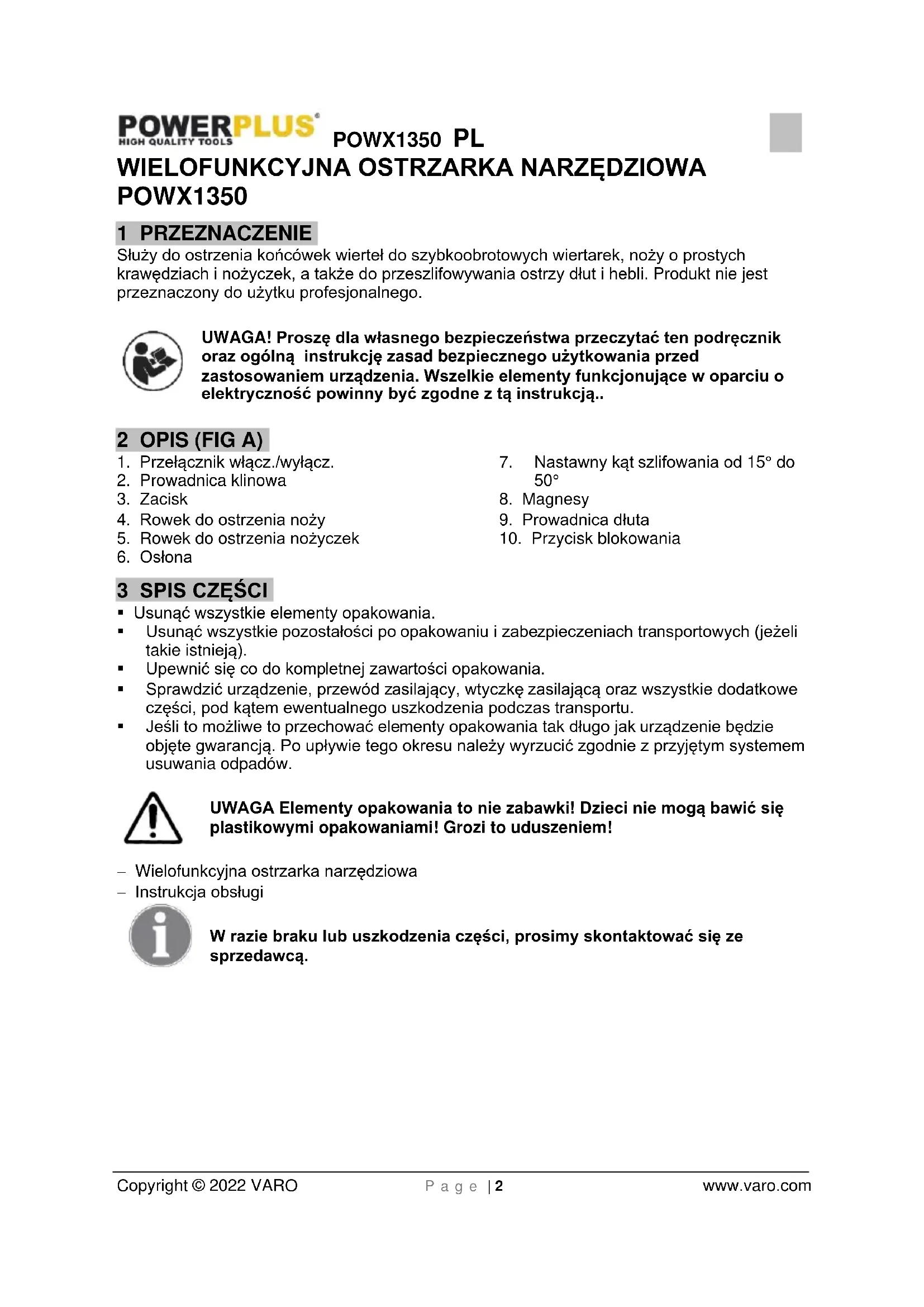 - Jako dowód zakupu należy zachować rachunek.POWX1350 PL Copyright © 2022 VARO P a g e | 9 www.varo.com