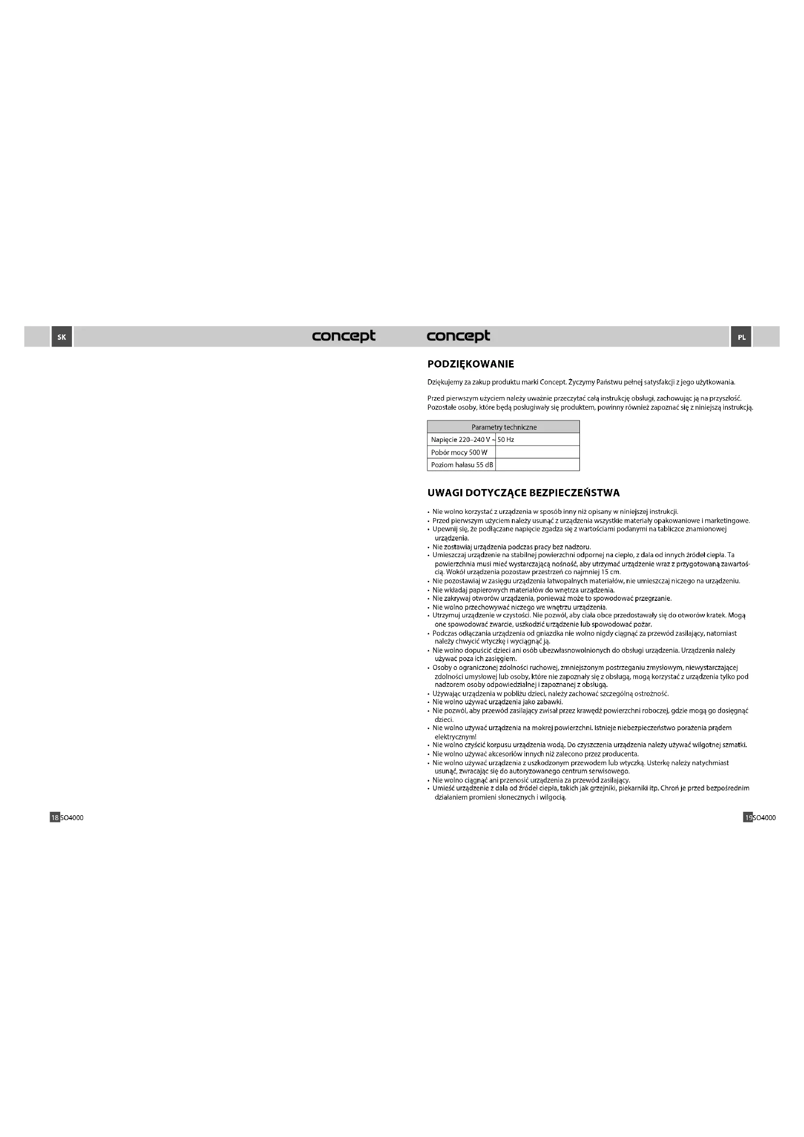 18 SO4000 PODZIĘKOWANIE Dziękujemy zazakup produktu marki Concept. Życzymy Państwu pełnej satysfakcji zjego użytkowania. Przed pierwszym użyciem należy uważnie przeczytać całą instrukcję obsługi, zachowując ją naprzyszłość. Pozostałe osoby, które będą posługiwały się produktem, powinny również zapoznać się zniniejszą instrukcją. Parametry techniczne Napięcie 220–240 V~ 50 Hz Pobór mocy 500 W Poziom hałasu 55 dB