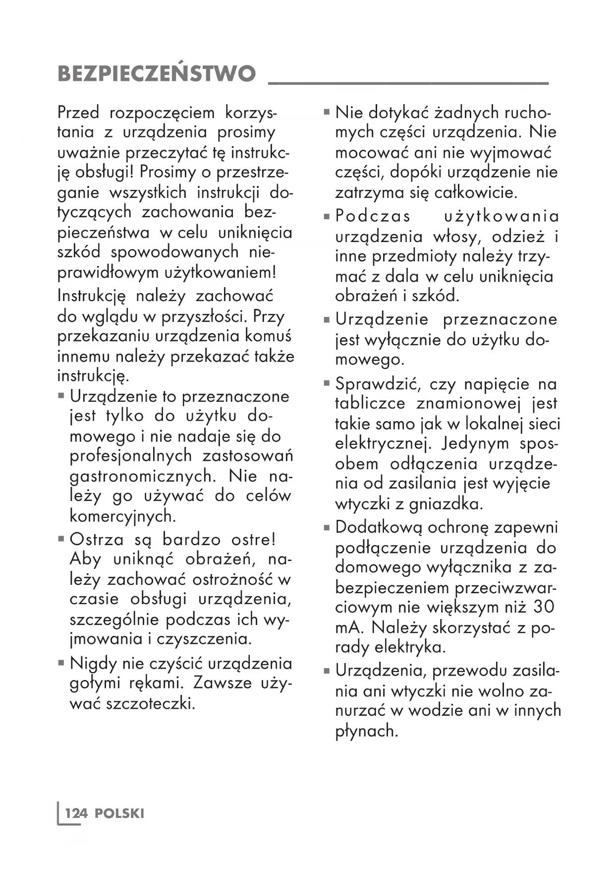 Dodatkową ochronę zapewni podłączenie urządzenia do domowego wyłącznika z za- bezpieczeniem przeciwzwar- ciowym nie większym niż 30 mA. Należy skorzystać z po- rady elektryka.