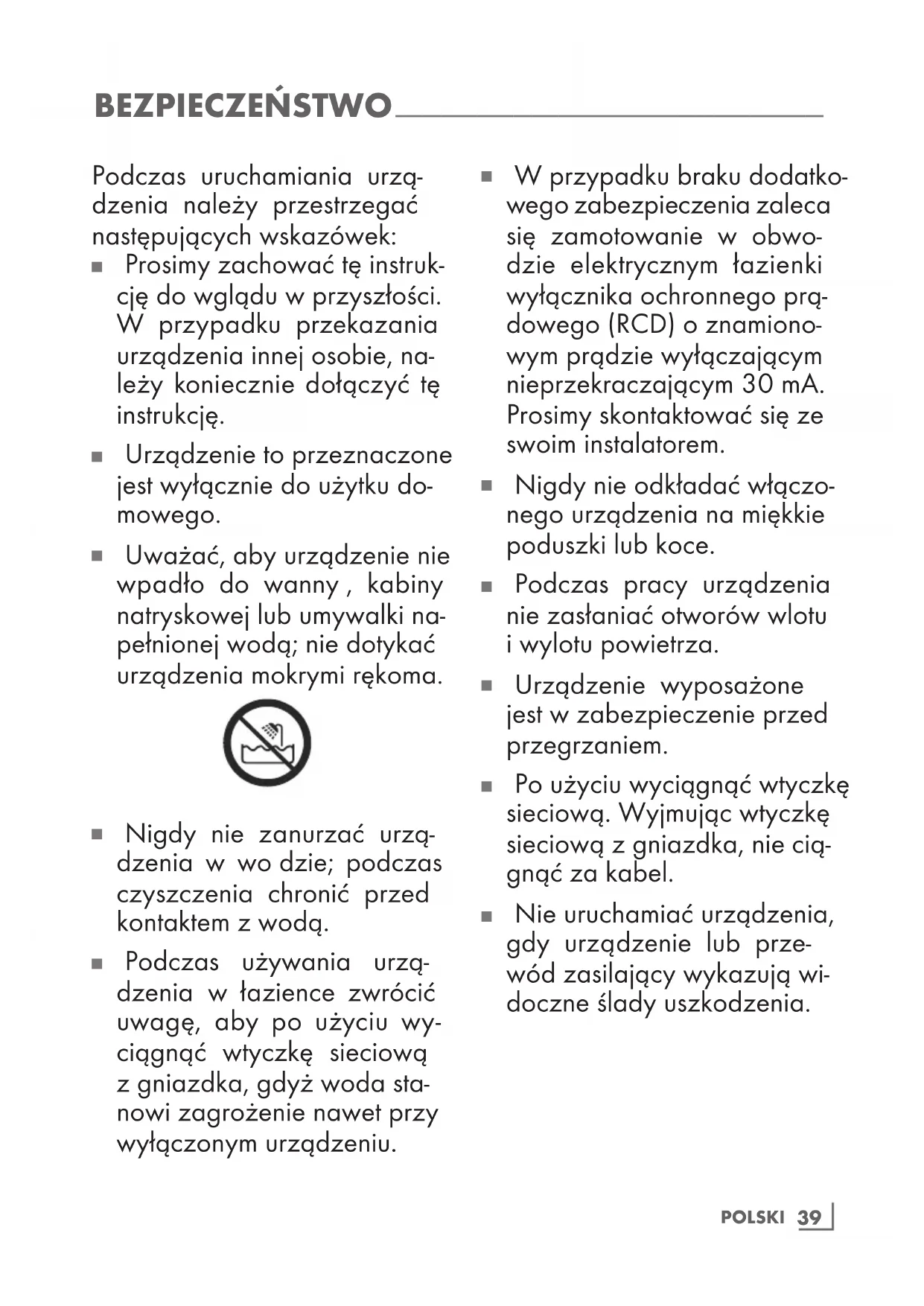 Podczas używania urzą- dzenia w łazience zwrócić uwagę, aby po użyciu wy- ciągnąć wtyczkę sieciową z gniazdka, gdyż woda sta- nowi zagrożenie nawet przy wyłączonym urządzeniu.40 POLSKI