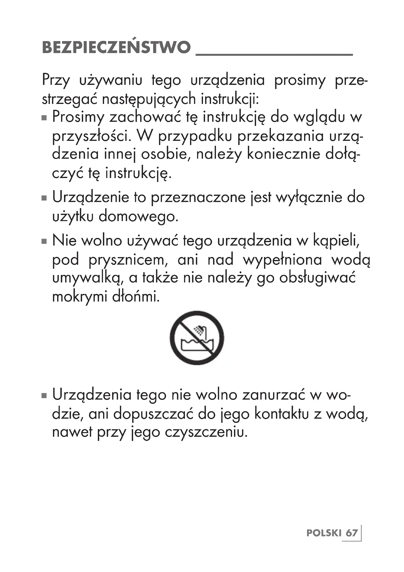 Nie wolno używać tego urządzenia w kąpieli, pod prysznicem, ani nad wypełniona wodą umywalką, a także nie należy go obsługiwać mokrymi dłońmi.