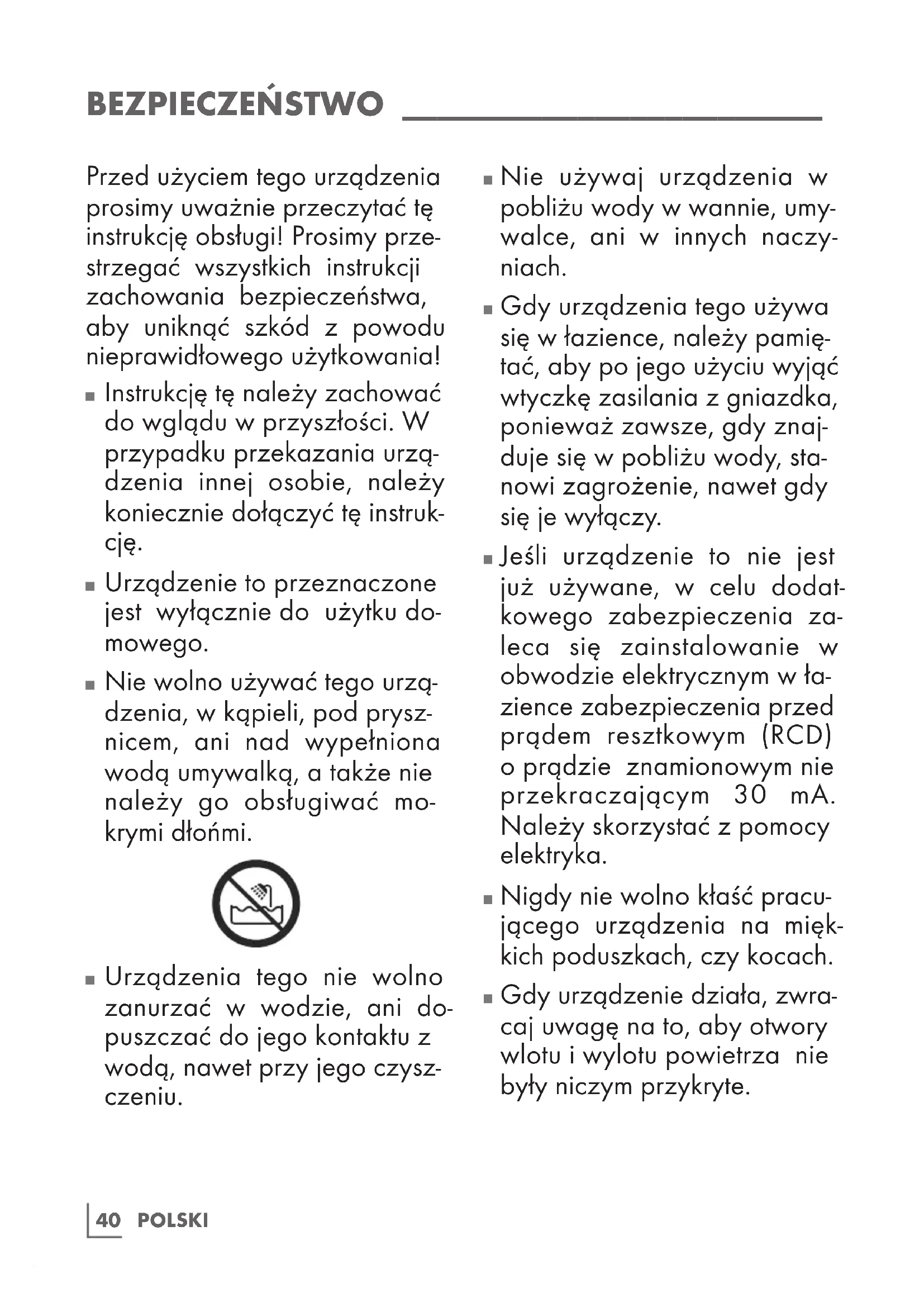 , 50/60 Hz Snaga: 1600 - 2000 W Klasa električne izolacije: II Zadržavamo pravo na tehničke i dizajnerske iz- mjene. INFORMACIJE _____________________________40 POLSKI BEZPIECZEŃSTWO ________________________ Przed użyciem tego urządzenia prosimy uważnie przeczytać tę instrukcję obsługi! Prosimy prze- strzegać wszystkich instrukcji zachowania bezpieczeństwa, aby uniknąć szkód z powodu nieprawidłowego użytkowania!