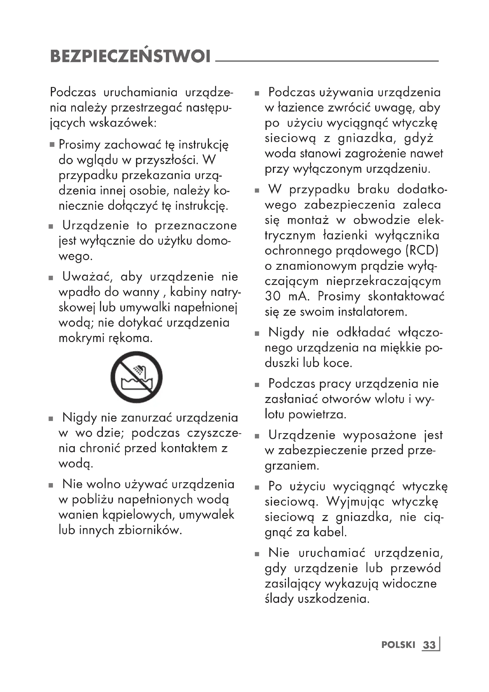 Nie wolno używać urządzenia w pobliżu napełnionych wodą wanien kąpielowych, umywalek lub innych zbiorników.34 POLSKI