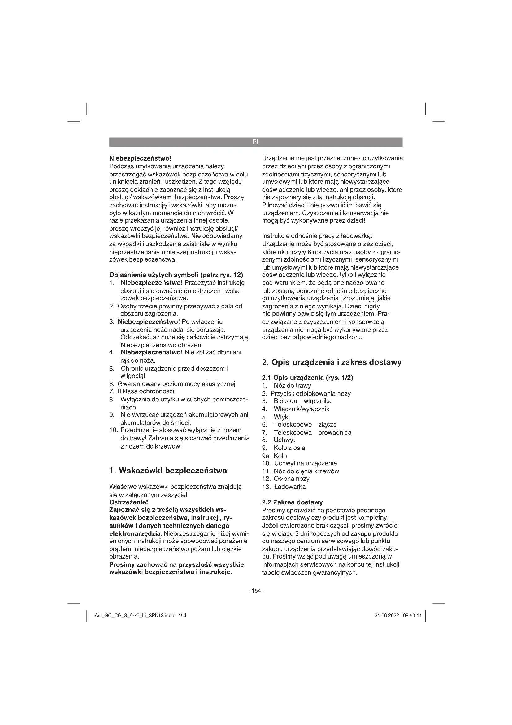 Prosimy sprawdzić na podstawie podanego zakresu dostawy czy produkt jest kompletny. Jeżeli stwierdzono brak części, prosimy zwrócić się w ciągu 5 dni roboczych od zakupu produktu do naszego centrum serwisowego lub punktu zakupu urządzenia przedstawiając dowód zaku- pu. Prosimy wziąć pod uwagę umieszczoną w informacjach serwisowych na końcu tej instrukcji tabelę świadczeń gwarancyjnych. Anl_GC_CG_3_6-70_Li_SPK13.indb 154Anl_GC_CG_3_6-70_Li_SPK13.indb 154 21.06.2022 08:53:1121.06.2022 08:53:11PL
