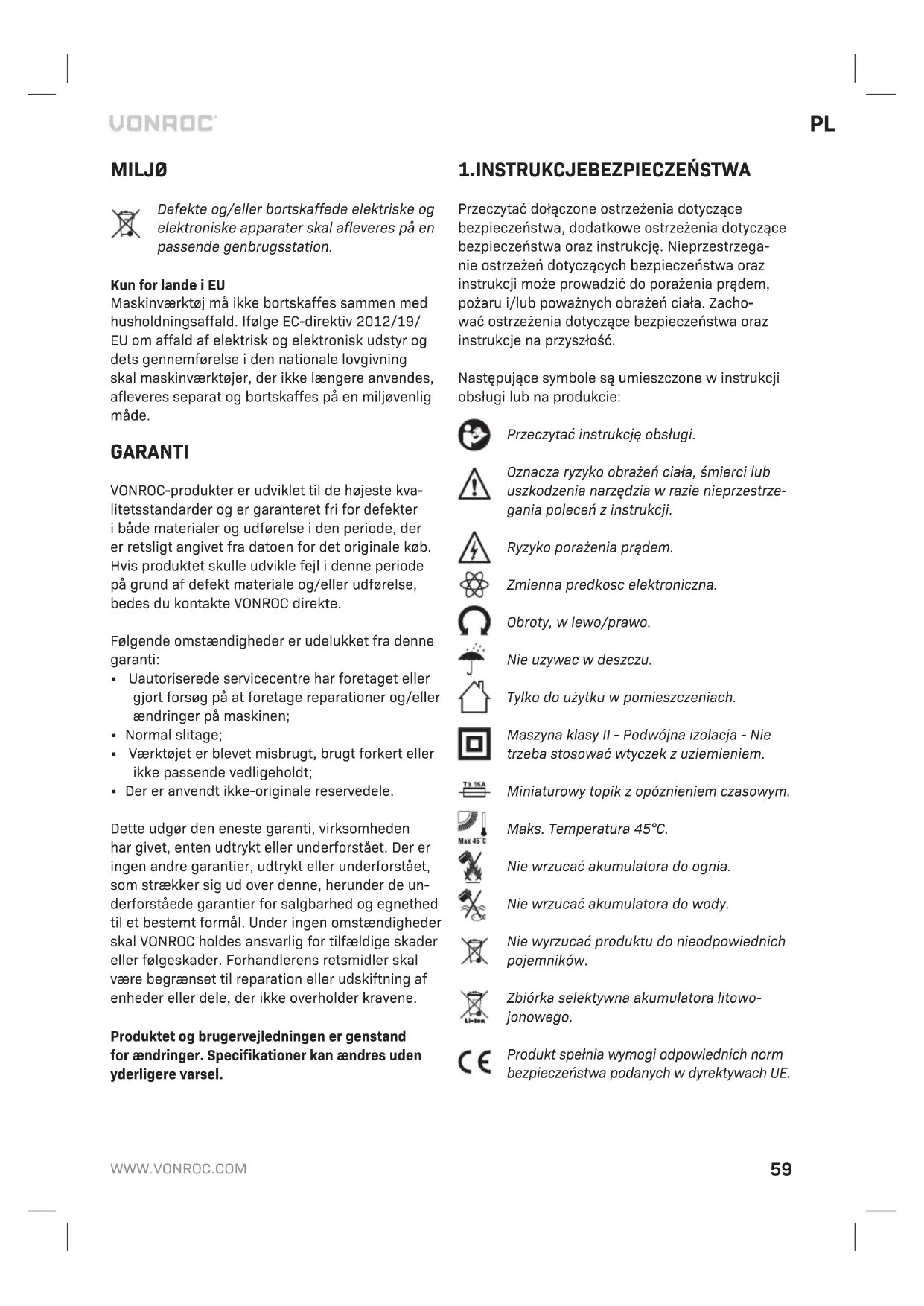 Przed rozpoczeciem czyszczenia i konser- wacji zawsze wylaczac maszyne i wyjmo- wac z niej akumulator. Czyscic obudowe maszyny regularnie miekka scie- reczka, najlepiej po kazdym uzyciu. Dopilnowac, aby otwory wentylacyjne byly wolne od pylu, kurzu i zabrudzen. Usuwac oporne zabrudzenia miekka sciereczka zwilzona mydlinami. Nie uzywac zad- nych rozpuszczalników, takich jak benzyna, alkohol, amoniak itp. Takie substancje chemiczne spowodu- ja uszkodzenie czesci z tworzyw sztucznych. SRODOWISKO Uszkodzone i/lub niepotrzebne urzadzenia elektryczne lub elektroniczne podlegaja zbiórce w odpowiednich punktach recyklingu. Tylko kraje WE Nie wyrzucac elektronarzedzi wraz z odpadami z gospodarstw domowych. Zgodnie z dyrektywa 2012/19/WE dotyczaca zuzytych urzadzen elek- trycznych i elektronicznych oraz jej wdrozeniem do prawodawstwa krajowego, elektronarzedzia, które juz nie nadaja sie do uzytku, podlegaja oddziel- nej zbiórce oraz utylizacji w sposób przyjazny dla srodowiska. GWARANCJA Produkty VONROC są wytwarzane zgodnie z naj- wyższymi standardami jakości i producent udziela gwarancji na wady materiałowe i wady wykonania na okres wymagany prawem, licząc od dnia zaku- pu. Jeśli wystąpi usterka produktu w tym okresie spowodowana wadą materiałową i/lub wadą wykonania, proszę bezpośrednio skontaktować się ze sprzedawcą VONROC. Następujące okoliczności powodują unieważnienie gwarancji:
