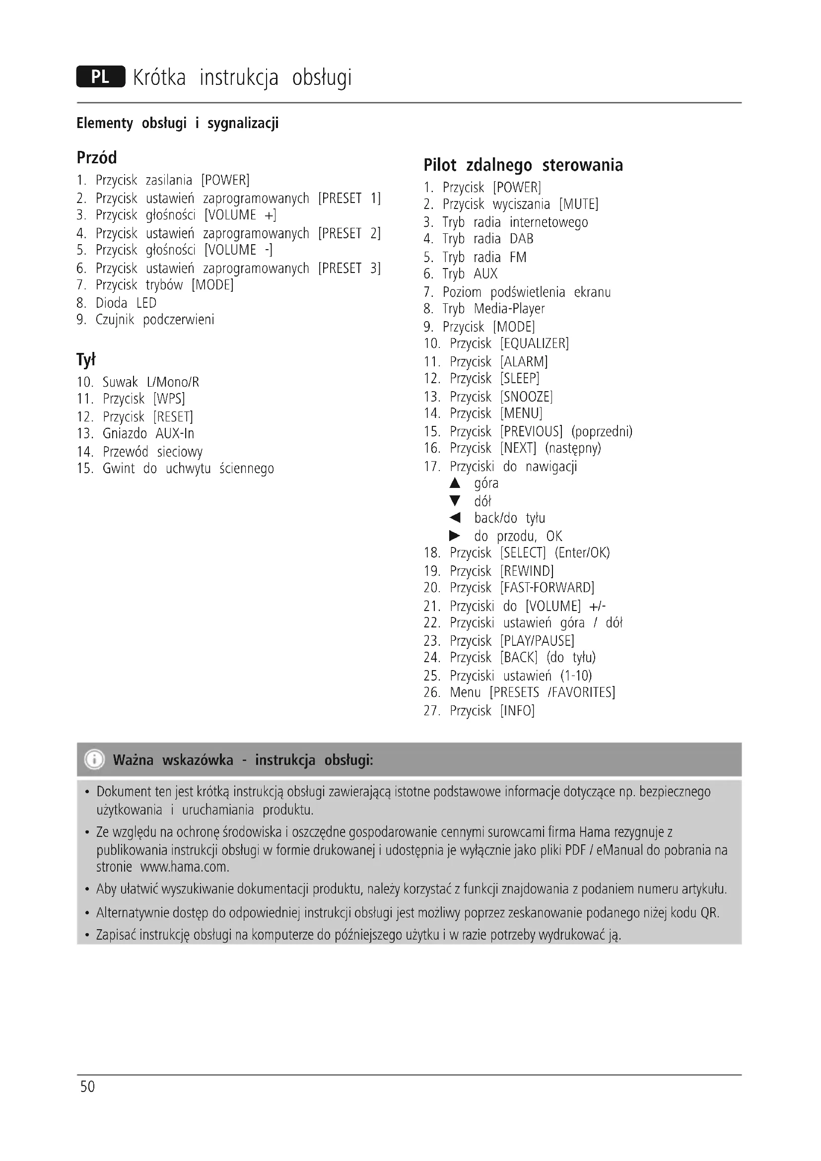Pobierz instrukcję dla swojego Radio w formacie PDF za darmo! Znajdź swoją instrukcję IR80MBT - HAMA i weź swoje urządzenie elektroniczne z powrotem w ręce. Na tej stronie opublikowane są wszystkie dokumenty niezbędne do korzystania z urządzenia. IR80MBT marki HAMA.