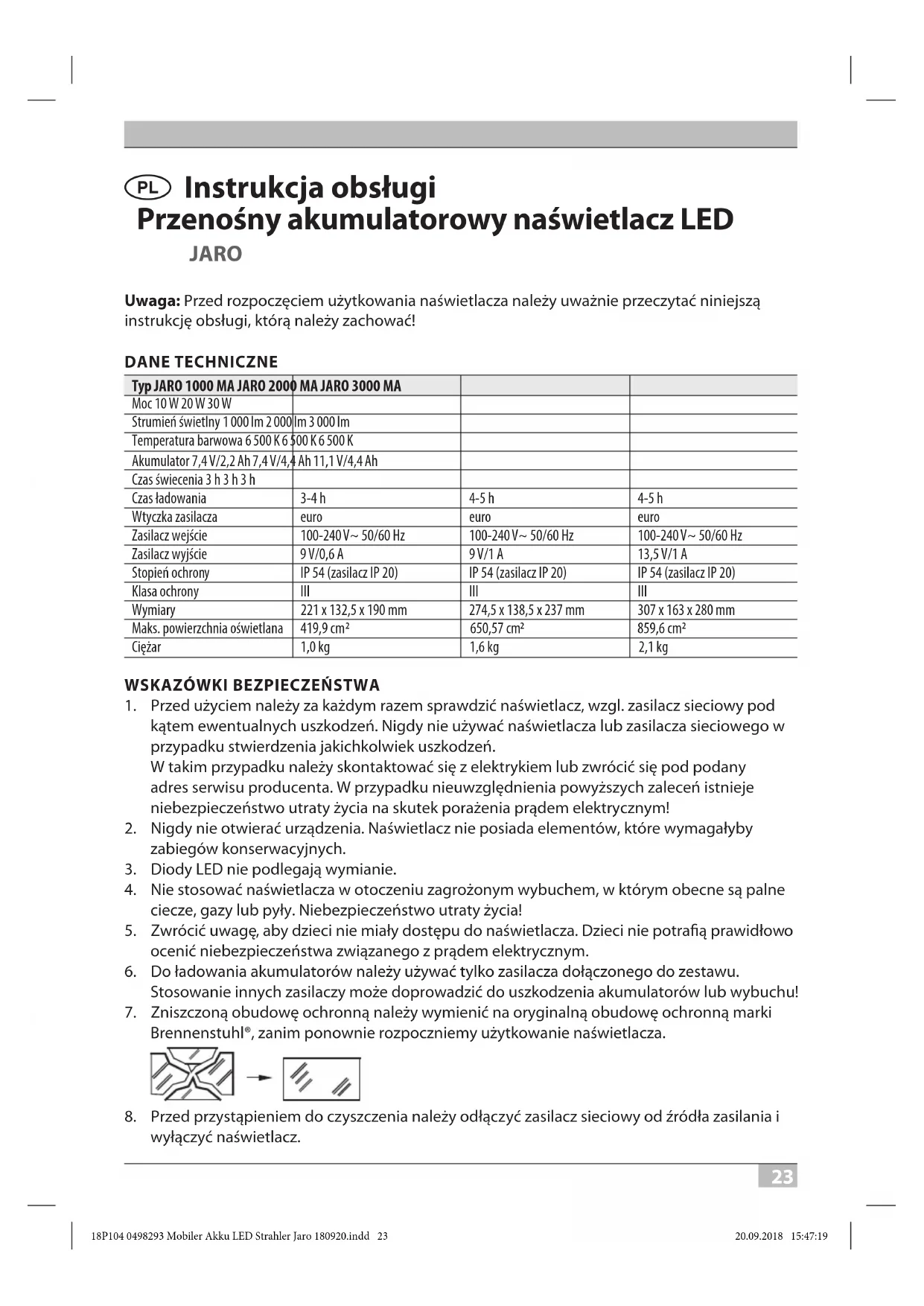 La declaración de conformidad ha sido dispuesta por el fabricante. Dirección Hugo Brennenstuhl GmbH & Co. KG Seestraße 1 – 3 · D-72074 Tübingen H. Brennenstuhl S.A.S. 4 rue de Bruxelles ∙ F-67170 Bernolsheim lectra-t ag Blegistrasse 13 ∙ CH-6340 Baar www.brennenstuhl.com 18P104 0498293 Mobiler Akku LED Strahler Jaro 180920.indd 22 20.09.2018 15:47:1823 N Instrukcja obsługi Przenośny akumulatorowy naświetlacz LED JARO Uwaga: Przed rozpoczęciem użytkowania naświetlacza należy uważnie przeczytać niniejszą instrukcję obsługi, którą należy zachować! DANE TECHNICZNE Typ JARO 1000 MA JARO 2000 MA JARO 3000 MA Moc 10 W 20 W 30 WStrumień świetlny 1 000 lm 2 000 lm 3 000 lmTemperatura barwowa 6 500 K 6 500 K 6 500 KAkumulator 7,4 V/2,2 Ah 7,4 V/4,4 Ah 11,1 V/4,4 AhCzas świecenia 3 h 3 h 3 hCzas ładowania 3-4 h 4-5 h 4-5 hWtyczka zasilacza euro euro euro Zasilacz wejście 100-240 V~ 50/60 Hz 100-240 V~ 50/60 Hz 100-240 V~ 50/60 Hz Zasilacz wyjście 9 V/0,6 A 9 V/1 A 13,5 V/1 A Stopień ochrony IP 54 (zasilacz IP 20) IP 54 (zasilacz IP 20) IP 54 (zasilacz IP 20) Klasa ochrony III III III Wymiary 221 x 132,5 x 190 mm 274,5 x 138,5 x 237 mm 307 x 163 x 280 mm Maks. powierzchnia oświetlana 419,9 cm 650,57 cm 859,6 cm Ciężar 1,0 kg 1,6 kg 2,1 kg