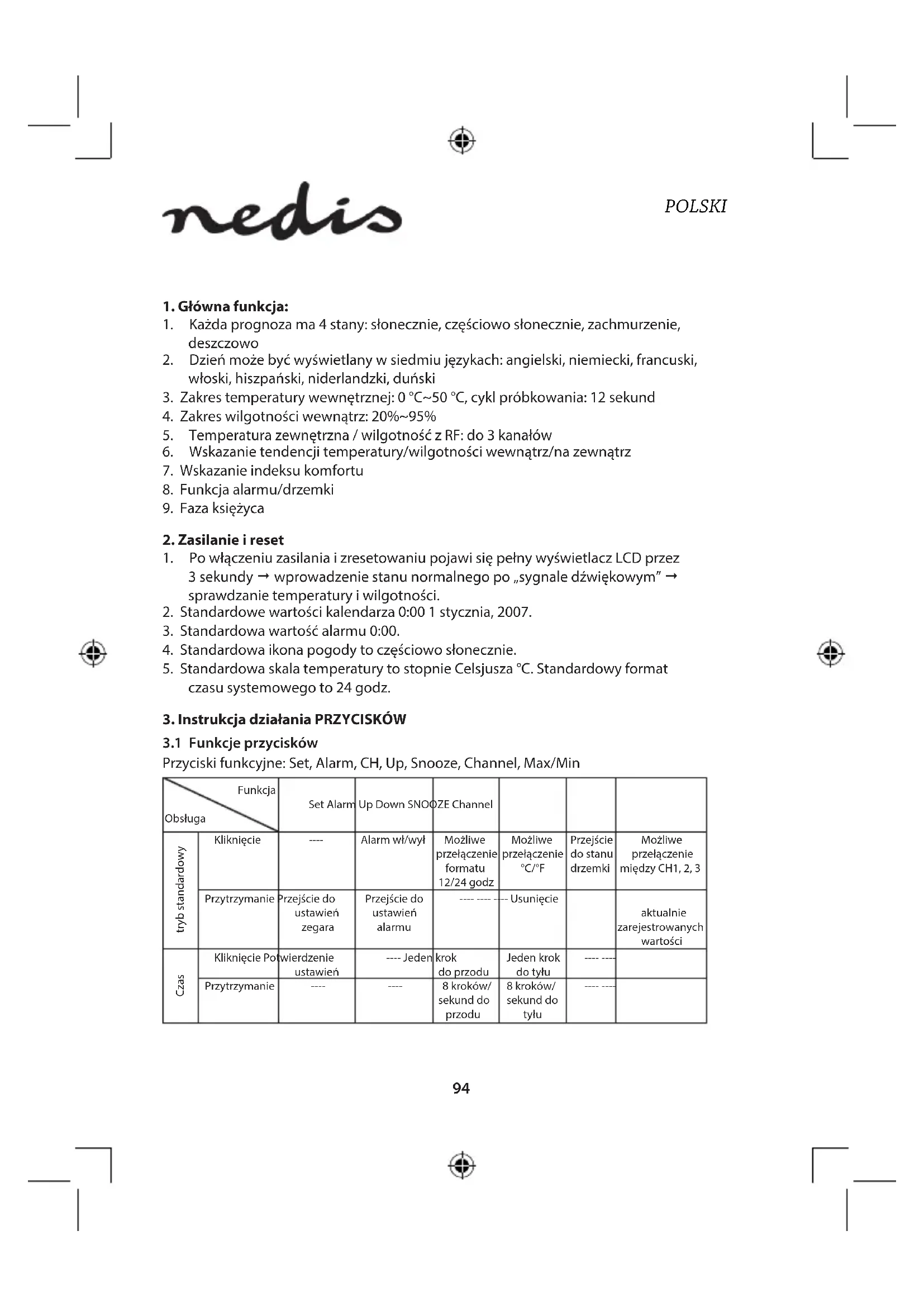 Przyciski funkcyjne: Set, Alarm, CH, Up, Snooze, Channel, Max/Min Funkcja Obsługa Set Alarm Up Down SNOOZE Channel tryb standardowy Kliknięcie ---- Alarm wł/wył Możliwe przełączenie formatu 12/24 godz Możliwe przełączenie °C/°F Przejście do stanu drzemki Możliwe przełączenie między CH1, 2, 3 Przytrzymanie Przejście do ustawień zegara Przejście do ustawień alarmu ---- ---- ---- Usunięcie aktualnie zarejestrowanych wartości Czas Kliknięcie Potwierdzenie ustawień ---- Jeden krok do przodu Jeden krok do tyłu