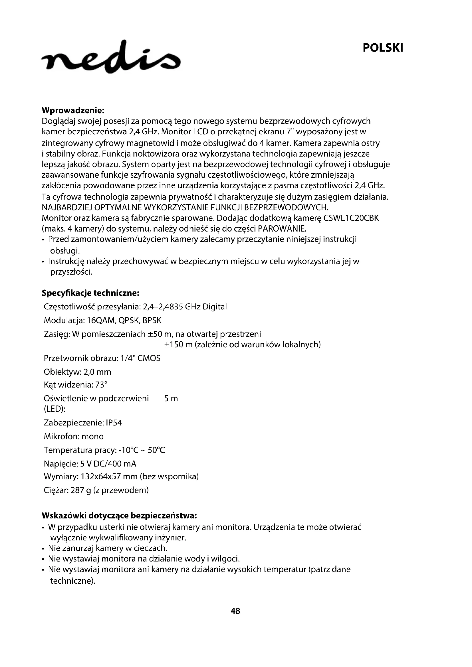 - Ta kontakt med leverandøren eller lokale myndigheter hvis du ønsker mer informasjon om avhending. Dette produktet har blitt produsert og levert i henhold til alle relevante bestemmelser og direktiver, gyldig for alle medlemsstater i EU. Det overholder også alle gjeldende spesikasjoner og bestemmelser i landet det selges i. Formell dokumentasjon er tilgjengelig på forespørsel. Dette inkluderer, men begrenser seg ikke til: Samsvarserklæring (og produktidentitet) dataark for materialsikkerhet produkttestrapport. Vennligst kontakt kundeservice for hjelp: på nettsiden: http://www.nedis.com/en-us/contact/contact-form.htm via e-post: service@nedis.com via telefon: +31 (0)73-5991055 (i kontortiden) NEDIS B.V., De Tweeling 28, 5215 MC ’s-Hertogenbosch, THE NETHERLANDS48 POLSKI Wprowadzenie: Doglądaj swojej posesji za pomocą tego nowego systemu bezprzewodowych cyfrowych kamer bezpieczeństwa 2,4 GHz. Monitor LCD o przekątnej ekranu 7" wyposażony jest w zintegrowany cyfrowy magnetowid i może obsługiwać do 4 kamer. Kamera zapewnia ostry i stabilny obraz. Funkcja noktowizora oraz wykorzystana technologia zapewniają jeszcze lepszą jakość obrazu. System oparty jest na bezprzewodowej technologii cyfrowej i obsługuje zaawansowane funkcje szyfrowania sygnału częstotliwościowego, które zmniejszają zakłócenia powodowane przez inne urządzenia korzystające z pasma częstotliwości 2,4 GHz. Ta cyfrowa technologia zapewnia prywatność i charakteryzuje się dużym zasięgiem działania. NAJBARDZIEJ OPTYMALNE WYKORZYSTANIE FUNKCJI BEZPRZEWODOWYCH. Monitor oraz kamera są fabrycznie sparowane. Dodając dodatkową kamerę CSWL1C20CBK (maks. 4 kamery) do systemu, należy odnieść się do części PAROWANIE.
