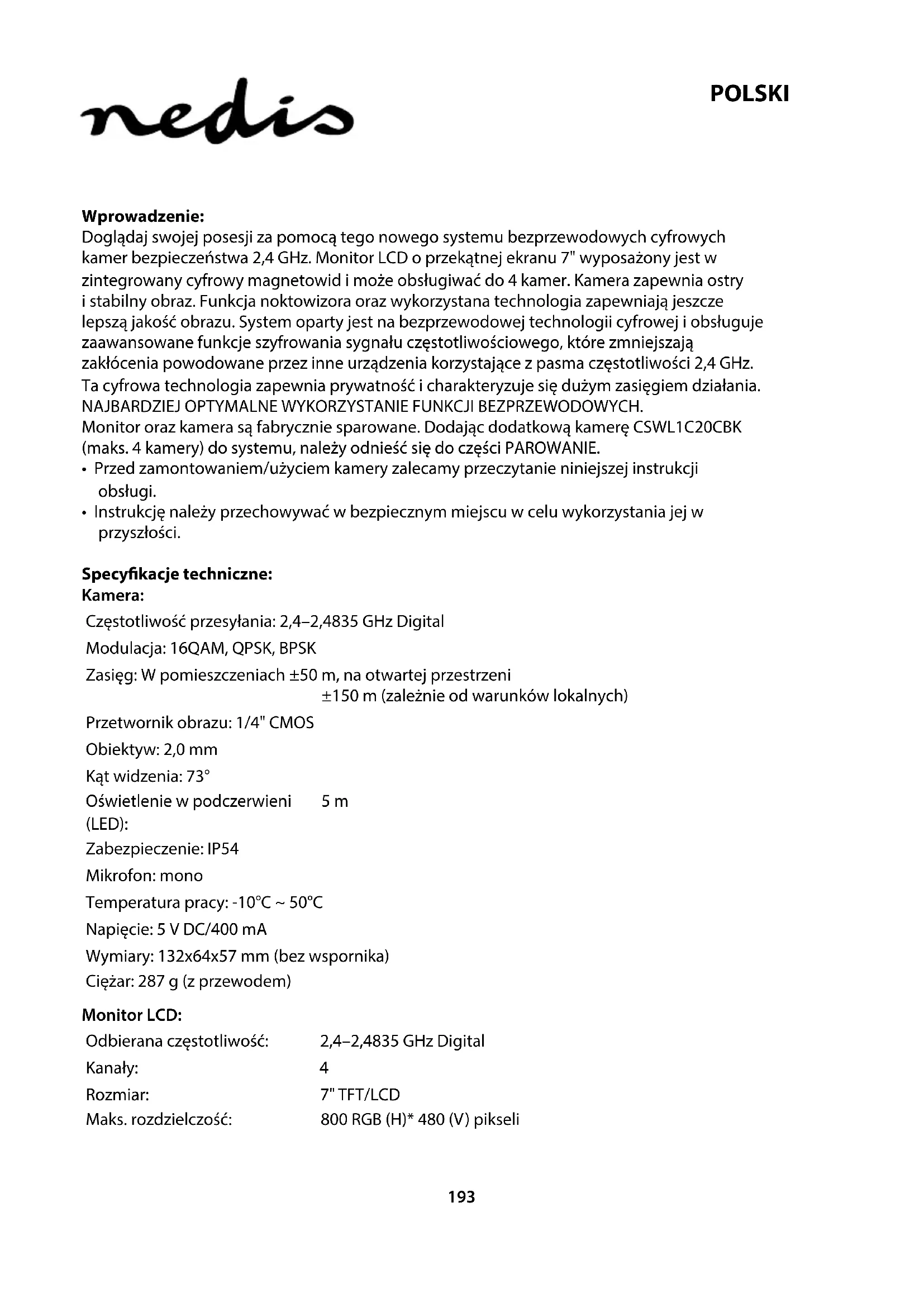 - Ta kontakt med leverandøren eller lokale myndigheter hvis du ønsker mer informasjon om avhending. Dette produktet har blitt produsert og levert i henhold til alle relevante bestemmelser og direktiver, gyldig for alle medlemsstater i EU. Det overholder også alle gjeldende spesikasjoner og bestemmelser i landet det selges i. Formell dokumentasjon er tilgjengelig på forespørsel. Dette inkluderer, men begrenser seg ikke til: Samsvarserklæring (og produktidentitet) dataark for materialsikkerhet produkttestrapport. Vennligst kontakt kundeservice for hjelp: på nettsiden: http://www.nedis.com/en-us/contact/contact-form.htm via e-post: service@nedis.com via telefon: +31 (0)73-5991055 (i kontortiden) NEDIS B.V., De Tweeling 28, 5215 MC ’s-Hertogenbosch, THE NETHERLANDS193 POLSKI Wprowadzenie: Doglądaj swojej posesji za pomocą tego nowego systemu bezprzewodowych cyfrowych kamer bezpieczeństwa 2,4 GHz. Monitor LCD o przekątnej ekranu 7" wyposażony jest w zintegrowany cyfrowy magnetowid i może obsługiwać do 4 kamer. Kamera zapewnia ostry i stabilny obraz. Funkcja noktowizora oraz wykorzystana technologia zapewniają jeszcze lepszą jakość obrazu. System oparty jest na bezprzewodowej technologii cyfrowej i obsługuje zaawansowane funkcje szyfrowania sygnału częstotliwościowego, które zmniejszają zakłócenia powodowane przez inne urządzenia korzystające z pasma częstotliwości 2,4 GHz. Ta cyfrowa technologia zapewnia prywatność i charakteryzuje się dużym zasięgiem działania. NAJBARDZIEJ OPTYMALNE WYKORZYSTANIE FUNKCJI BEZPRZEWODOWYCH. Monitor oraz kamera są fabrycznie sparowane. Dodając dodatkową kamerę CSWL1C20CBK (maks. 4 kamery) do systemu, należy odnieść się do części PAROWANIE.