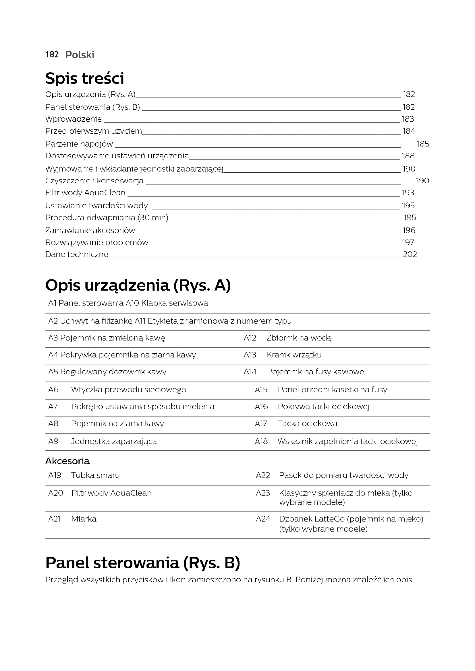 - Ikony napojów: espresso, espresso lungo, kawa, americano, cappuccino, latte macchiato, gorąca woda, para (tylko wybrane modele) Wprowadzenie Gratulujemy zakupu w pełni automatycznego ekspresu do kawy firmy Philips! Aby w pełni skorzystać z oferowanej przez firmę Philips pomocy, zarejestruj swój produkt na stronie internetowej www.philips.com/welcome. Przed skorzystaniem z urządzenia po raz pierwszy zapoznaj się dokładnie z osobną broszurą na temat bezpieczeństwa i zachowaj ją na przyszłość. Aby pomóc w opanowaniu podstawowych zasad obsługi ekspresu oraz zapewnić maksymalny komfort jego użytkowania, firma Philips oferuje wsparcie na wiele sposobów. W opakowaniu urządzenia znajduje się: 1 Niniejsza instrukcja obsługi zawierająca ilustrowane wskazówki dotyczące korzystania z urządzenia oraz bardziej szczegółowe informacje na temat jego czyszczenia i konserwacji. Istnieje wiele wersji tego ekspresu do kawy, które mają różne funkcje. Każda wersja ma swój numer typu. Numer typu znajduje się na etykiecie znamionowej wewnątrz klapki serwisowej (patrz rys. A11). 2 Osobna broszura z opisem zasad bezpiecznego użytkowania ekspresu. 3 Aby uzyskać pomoc techniczną online (często zadawane pytania, filmy itd.), należy zeskanować kod QR zamieszczony na okładce tej broszury lub odwiedzić stronę www.philips.com/coffee-care. To urządzenie zostało przetestowane przy użyciu kawy. Wprawdzie zostało gruntowanie oczyszczone, ale w środku mogły pozostać resztki kawy. Gwarantujemy jednak, że urządzenie jest całkowicie nowe. Ekspres automatycznie dostosowuje ilość zmielonej kawy niezbędną do uzyskania jak najlepszego w smaku napoju. Aby umożliwić urządzeniu przeprowadzenie samoregulacji, należy zaparzyć na początku 5 kaw. Przed pierwszym użyciem dzbanka LatteGo (pojemnika na mleko) lub klasycznego spieniacza do mleka należy je opłukać.184 Polski Przed pierwszym użyciem