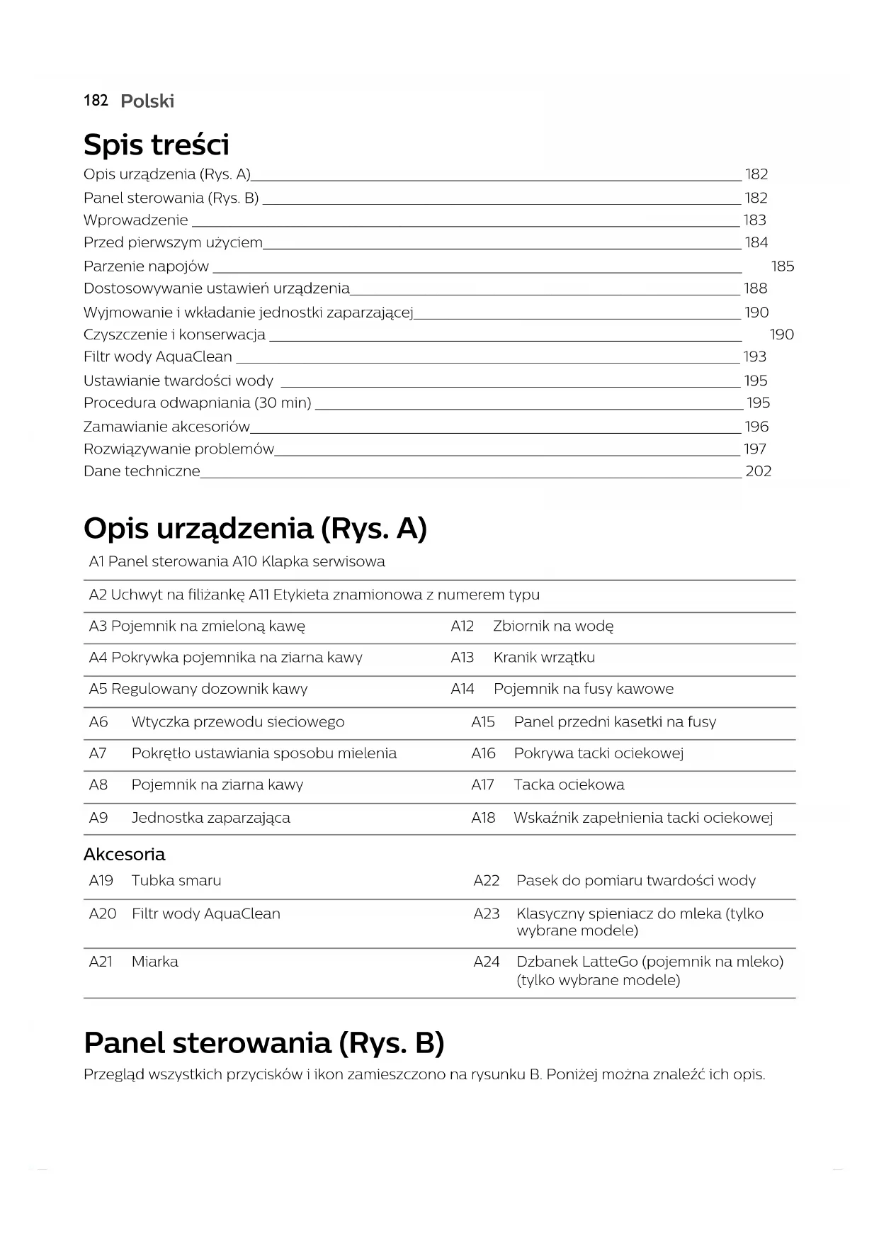 Polski Spis treści Opis urządzenia (Rys. A)______________________________________________________________________________ 182 Panel sterowania (Rys. B) ____________________________________________________________________________ 182 Wprowadzenie _______________________________________________________________________________________ 183 Przed pierwszym użyciem____________________________________________________________________________ 184 Parzenie napojów ____________________________________________________________________________________ 185 Dostosowywanie ustawień urządzenia______________________________________________________________ 188 Wyjmowanie i wkładanie jednostki zaparzającej____________________________________________________ 190 Czyszczenie i konserwacja ___________________________________________________________________________ 190 Filtr wody AquaClean ________________________________________________________________________________ 193 Ustawianie twardości wody _________________________________________________________________________ 195 Procedura odwapniania (30 min) ____________________________________________________________________ 195 Zamawianie akcesoriów______________________________________________________________________________ 196 Rozwiązywanie problemów__________________________________________________________________________ 197 Dane techniczne______________________________________________________________________________________ 202 Opis urządzenia (Rys. A) A1 Panel sterowania A10 Klapka serwisowa A2 Uchwyt na filiżankę A11 Etykieta znamionowa z numerem typu A3 Pojemnik na zmieloną kawę A12 Zbiornik na wodę A4 Pokrywka pojemnika na ziarna kawy A13 Kranik wrzątku A5 Regulowany dozownik kawy A14 Pojemnik na fusy kawowe A6 Wtyczka przewodu sieciowego A15 Panel przedni kasetki na fusy A7 Pokrętło ustawiania sposobu mielenia A16 Pokrywa tacki ociekowej A8 Pojemnik na ziarna kawy A17 Tacka ociekowa A9 Jednostka zaparzająca A18 Wskaźnik zapełnienia tacki ociekowej Akcesoria A19 Tubka smaru A22 Pasek do pomiaru twardości wody A20 Filtr wody AquaClean A23 Klasyczny spieniacz do mleka (tylko wybrane modele) A21 Miarka A24 Dzbanek LatteGo (pojemnik na mleko) (tylko wybrane modele) Panel sterowania (Rys. B) Przegląd wszystkich przycisków i ikon zamieszczono na rysunku B. Poniżej można znaleźć ich opis.183 Polski Polski Niektóre przyciski/ikony występują tylko w wybranych modelach. B1 Wyłącznik B7 Ikony ostrzeżenia B2 Ikony napojów* B8 Wskaźnik uruchomienia B3 Ikona mocy aromatu/kawy mielonej B9 Przycisk uruchomienia/zatrzymania B4 Ikona ilości napoju B10 Ikona funkcji antywapiennej Calc / Clean B5 Ikona ilości mleka (tylko wybrane modele) B11 Ikona AquaClean B6 Ikona temperatury kawy (tylko wybrane modele)