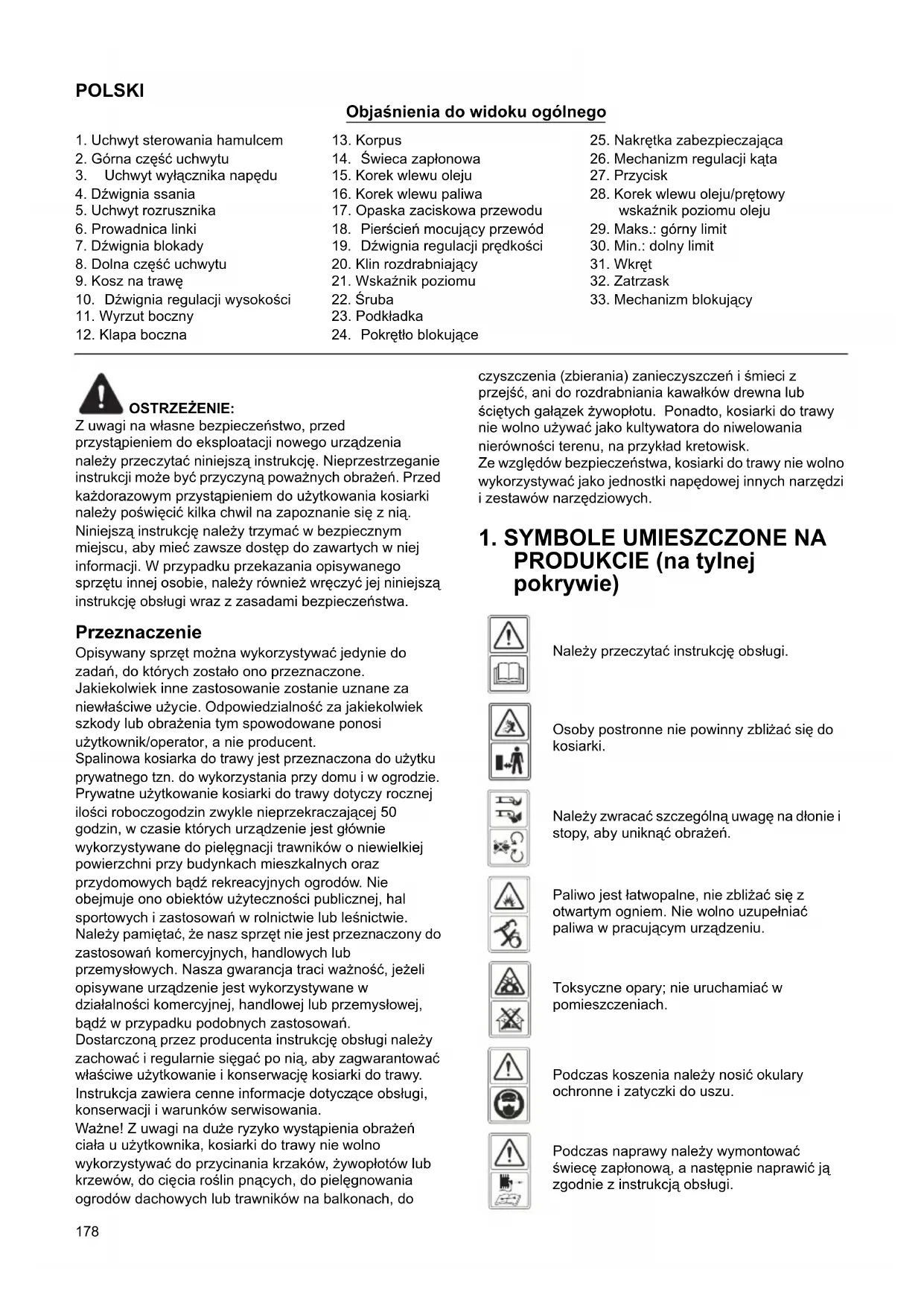 VASTAVUSDEKLARATSIOON Ainult Euroopa riigid EÜ vastavusdeklaratsioon on sellele kasutusjuhendile lisatud kui Lisa A.178 POLSKI Objaśnienia do widoku ogólnego OSTRZEŻENIE: Z uwagi na własne bezpieczeństwo, przed przystąpieniem do eksploatacji nowego urządzenia należy przeczytać niniejszą instrukcję. Nieprzestrzeganie instrukcji może być przyczyną poważnych obrażeń. Przed każdorazowym przystąpieniem do użytkowania kosiarki należy poświęcić kilka chwil na zapoznanie się z nią. Niniejszą instrukcję należy trzymać w bezpiecznym miejscu, aby mieć zawsze dostęp do zawartych w niej informacji. W przypadku przekazania opisywanego sprzętu innej osobie, należy również wręczyć jej niniejszą instrukcję obsługi wraz z zasadami bezpieczeństwa. Przeznaczenie Opisywany sprzęt można wykorzystywać jedynie do zadań, do których zostało ono przeznaczone. Jakiekolwiek inne zastosowanie zostanie uznane za niewłaściwe użycie. Odpowiedzialność za jakiekolwiek szkody lub obrażenia tym spowodowane ponosi użytkownik/operator, a nie producent. Spalinowa kosiarka do trawy jest przeznaczona do użytku prywatnego tzn. do wykorzystania przy domu i w ogrodzie. Prywatne użytkowanie kosiarki do trawy dotyczy rocznej ilości roboczogodzin zwykle nieprzekraczającej 50 godzin, w czasie których urządzenie jest głównie wykorzystywane do pielęgnacji trawników o niewielkiej powierzchni przy budynkach mieszkalnych oraz przydomowych bądź rekreacyjnych ogrodów. Nie obejmuje ono obiektów użyteczności publicznej, hal sportowych i zastosowań w rolnictwie lub leśnictwie. Należy pamiętać, że nasz sprzęt nie jest przeznaczony do zastosowań komercyjnych, handlowych lub przemysłowych. Nasza gwarancja traci ważność, jeżeli opisywane urządzenie jest wykorzystywane w działalności komercyjnej, handlowej lub przemysłowej, bądź w przypadku podobnych zastosowań. Dostarczoną przez producenta instrukcję obsługi należy zachować i regularnie sięgać po nią, aby zagwarantować właściwe użytkowanie i konserwację kosiarki do trawy. Instrukcja zawiera cenne informacje dotycz ące obsług
