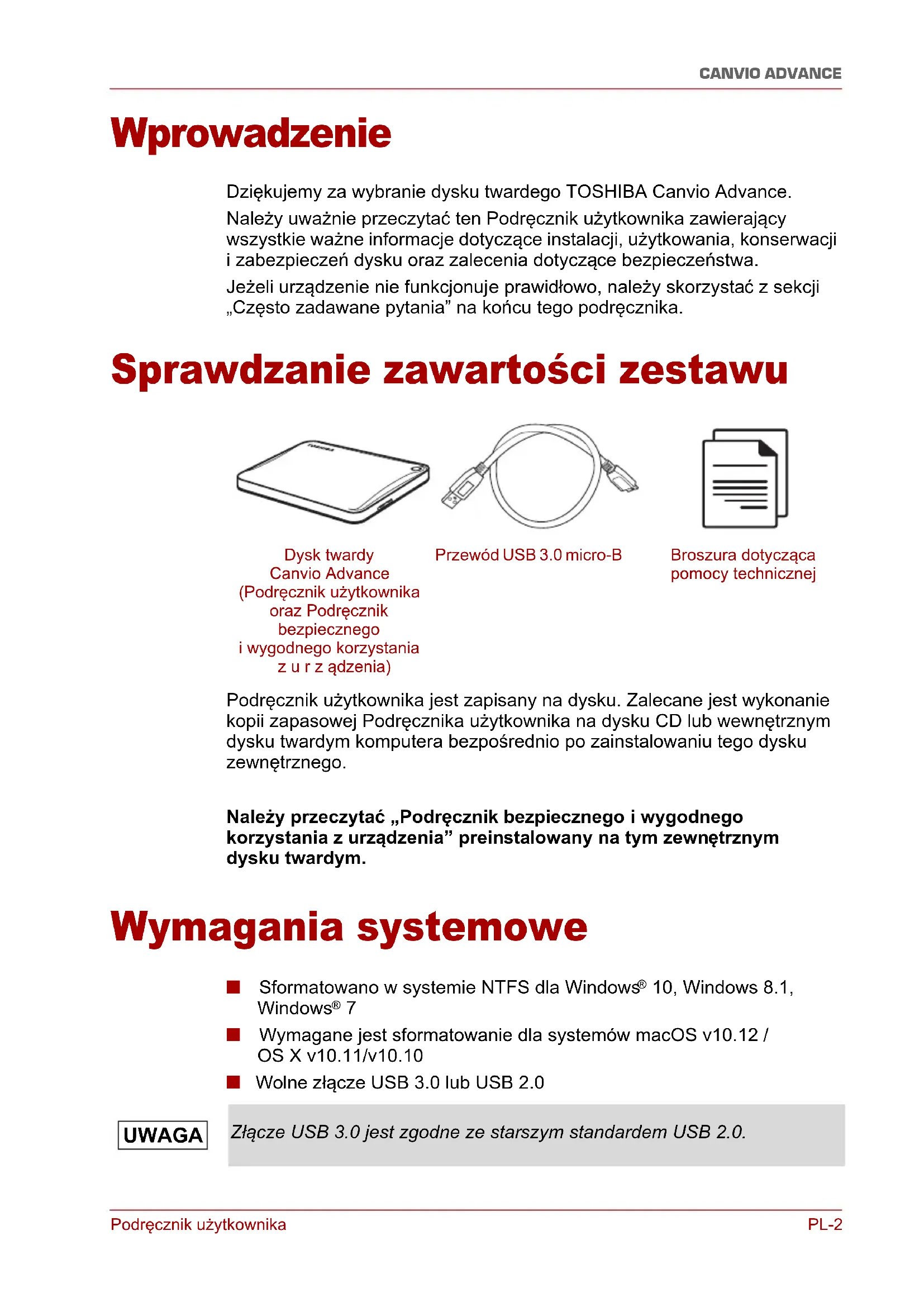 - Przepisy Podręcznik użytkownika PL-2 CANVIO ADVANCE Wprowadzenie Dziękujemy za wybranie dysku twardego TOSHIBA Canvio Advance. Należy uważnie przeczytać ten Podręcznik użytkownika zawierający wszystkie ważne informacje dotyczące instalacji, użytkowania, konserwacji i zabezpieczeń dysku oraz zalecenia dotyczące bezpieczeństwa. Jeżeli urządzenie nie funkcjonuje prawidłowo, należy skorzystać z sekcji „Często zadawane pytania” na końcu tego podręcznika. Sprawdzanie zawartości zestawu Podręcznik użytkownika jest zapisany na dysku. Zalecane jest wykonanie kopii zapasowej Podręcznika użytkownika na dysku CD lub wewnętrznym dysku twardym komputera bezpośrednio po zainstalowaniu tego dysku zewnętrznego. Należy przeczytać „Podręcznik bezpiecznego i wygodnego korzystania z urządzenia” preinstalowany na tym zewnętrznym dysku twardym. Wymagania systemowe ■ Sformatowano w systemie NTFS dla Windows p. 7
