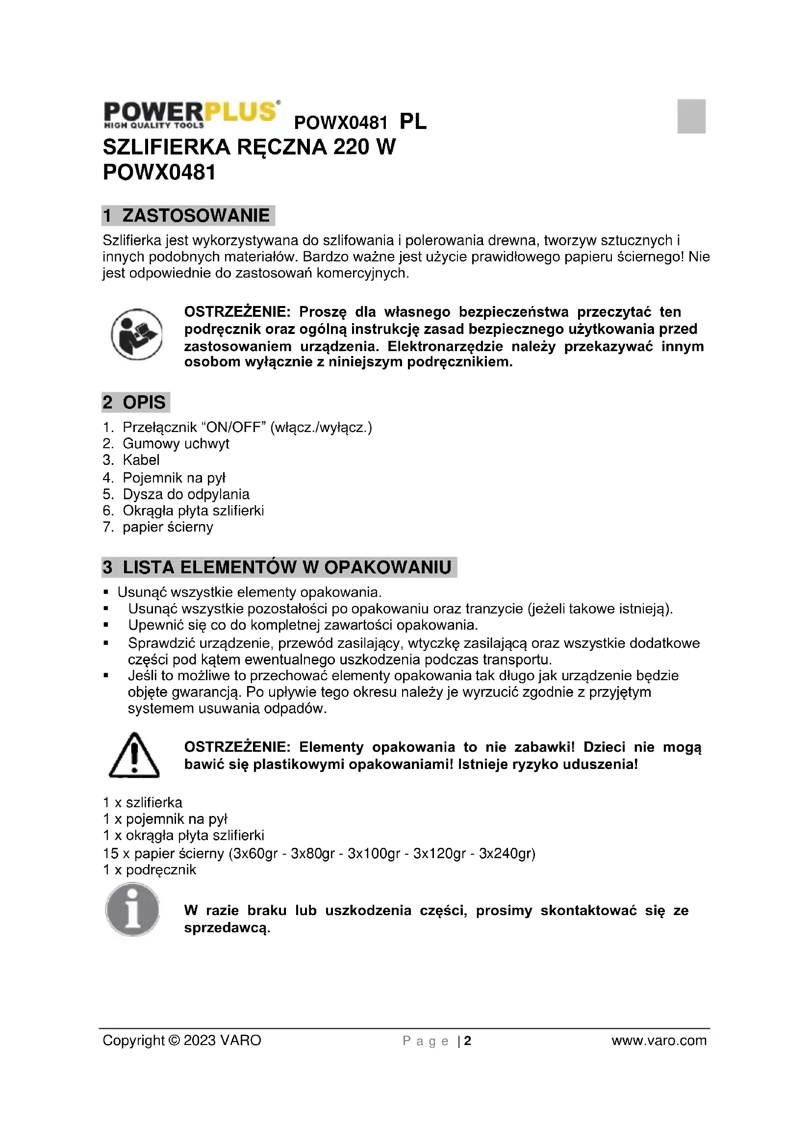 - Jeśli to możliwe to przechować elementy opakowania tak długo jak urządzenie będzie objęte gwarancją. Po upływie tego okresu należy je wyrzucić zgodnie z przyjętym systemem usuwania odpadów. OSTRZEŻENIE: Elementy opakowania to nie zabawki! Dzieci nie mogą bawić się plastikowymi opakowaniami! Istnieje ryzyko uduszenia! 1 x szlifierka 1 x pojemnik na pył 1 x okrągła płyta szlifierki 15 x papier ścierny (3x60gr - 3x80gr - 3x100gr - 3x120gr - 3x240gr) 1 x podręcznik W razie braku lub uszkodzenia części, prosimy skontaktować się ze sprzedawcą.POWX0481 PL Copyright © 2023 VARO P a g e | 3 www.varo.com 4 SYMBOLE W niniejszej instrukcji i na urządzeniu zastosowano następujące symbole: