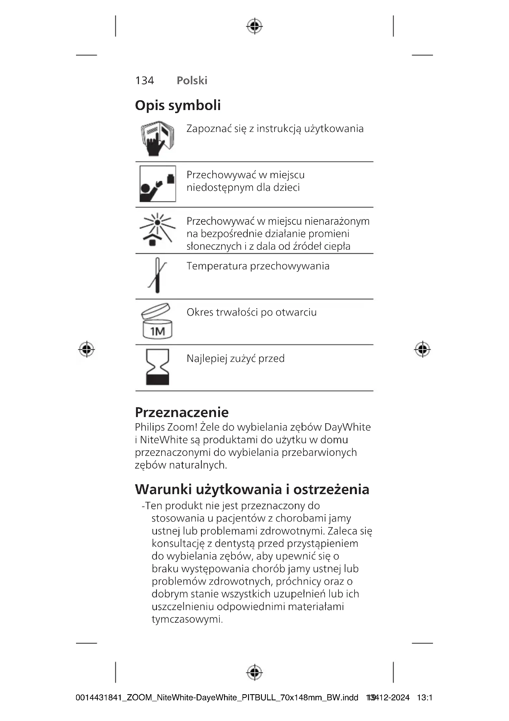 - Gwarancja WAŻNE PRZED UŻYCIEM TEGO PRODUKTU NALEŻY PRZECZYTAĆ WSZYSTKIE INSTRUKCJE. 300014431841_ZOOM_NiteWhite-DayeWhite_PITBULL_70x148mm_BW.indd 133300014431841_ZOOM_NiteWhite-DayeWhite_PITBULL_70x148mm_BW.indd 13319-12-2024 13:1219-12-2024 13:12134 Polski Polski 135 Opis symboli Zapoznać się z instrukcją użytkowania Przechowywać w miejscu niedostępnym dla dzieci Przechowywać w miejscu nienarażonym na bezpośrednie działanie promieni słonecznych i z dala od źródeł ciepła Temperatura przechowywania Okres trwałości po otwarciu Najlepiej zużyć przed Przeznaczenie Philips Zoom! Żele do wybielania zębów DayWhite i NiteWhite są produktami do użytku w domu przeznaczonymi do wybielania przebarwionych zębów naturalnych. Warunki użytkowania i ostrzeżenia - Ten produkt nie jest przeznaczony do stosowania u pacjentów z chorobami jamy ustnej lub problemami zdrowotnymi. Zaleca się konsultację z dentystą przed przystąpieniem do wybielania zębów, aby upewnić się o braku występowania chorób jamy ustnej lub problemów zdrowotnych, próchnicy oraz o dobrym stanie wszystkich uzupełnień lub ich uszczelnieniu odpowiednimi materiałami tymczasowymi. - Przed zabiegiem należy przeprowadzić higienizację zębów w celu usunięcia kamienia nazębnego i łatwo usuwalnych przebarwień zewnętrznych. - Wyrób przeznaczony do sprzedaży wyłącznie lekarzom dentystom. W każdym cyklu stosowania pierwsze zastosowanie przez lekarza dentystę lub pod jego bezpośrednim nadzorem, o ile zapewnia to równoważny poziom bezpieczeństwa. Następnie wyrób wydaje się konsumentowi do dokończenia cyklu stosowania. - Nie stosować u osób poniżej 18. roku życia. - Nie stosować produktu na dwa tygodnie przed lub bezpośrednio po wypełnieniu zębów. - Produkt nie jest przeznaczony do użycia przez kobiety wciąży, nałogowych palaczy tytoniu i/ lub konsumentów alkoholu. - Nie stosować u pacjentów z nadwrażliwością zębów i dużymi ubytkami odsłaniającymi miazgę. - Produkty DayWhite i NiteWhite zawierają nadtlenek wodoru lub nadtlenek karbamidu. Unikać kontaktu z oczami i skórą. W przypadku dostania się preparatu do oczu natychmiast przepłukać je wodą. - NiteWhite 10% nadtlenek karbamidu: Uwalnia 3,5% nadtlenek wodoru. - NiteWhite 16% nadtlenek karbamidu: Uwalnia 5,9% nadtlenek wodoru. - DayWhite 6%: Zawiera nadtlenek wodoru w stężeniu 6%. - Zawiera uorek sodu. - W strzykawkach może występować niewielkie ciśnienie. Nasadkę należy zdejmować ostrożnie, kierując ją z dala od twarzy. - Nie połykać kosmetyku ani jego części. - W razie wystąpienia nudności lub wymiotów należy natychmiast powiadomić dentystę lub lekarza ogólnego. 300014431841_ZOOM_NiteWhite-DayeWhite_PITBULL_70x148mm_BW.indd 134300014431841_ZOOM_NiteWhite-DayeWhite_PITBULL_70x148mm_BW.indd 13419-12-2024 13:1219-12-2024 13:12134 Polski Polski 135 Opis symboli Zapoznać się z instrukcją użytkowania Przechowywać w miejscu niedostępnym dla dzieci Przechowywać w miejscu nienarażonym na bezpośrednie działanie promieni słonecznych i z dala od źródeł ciepła Temperatura przechowywania Okres trwałości po otwarciu Najlepiej zużyć przed Przeznaczenie Philips Zoom! Żele do wybielania zębów DayWhite i NiteWhite są produktami do użytku w domu przeznaczonymi do wybielania przebarwionych zębów naturalnych. Warunki użytkowania i ostrzeżenia - Ten produkt nie jest przeznaczony do stosowania u pacjentów z chorobami jamy ustnej lub problemami zdrowotnymi. Zaleca się konsultację z dentystą przed przystąpieniem do wybielania zębów, aby upewnić się o braku występowania chorób jamy ustnej lub problemów zdrowotnych, próchnicy oraz o dobrym stanie wszystkich uzupełnień lub ich uszczelnieniu odpowiednimi materiałami tymczasowymi. - Przed zabiegiem należy przeprowadzić higienizację zębów w celu usunięcia kamienia nazębnego i łatwo usuwalnych przebarwień zewnętrznych. - Wyrób przeznaczony do sprzedaży wyłącznie lekarzom dentystom. W każdym cyklu stosowania pierwsze zastosowanie przez lekarza dentystę lub pod jego bezpośrednim nadzorem, o ile zapewnia to równoważny poziom bezpieczeństwa. Następnie wyrób wydaje się konsumentowi do dokończenia cyklu stosowania. - Nie stosować u osób poniżej 18. roku życia. - Nie stosować produktu na dwa tygodnie przed lub bezpośrednio po wypełnieniu zębów. - Produkt nie jest przeznaczony do użycia przez kobiety wciąży, nałogowych palaczy tytoniu i/ lub konsumentów alkoholu. - Nie stosować u pacjentów z nadwrażliwością zębów i dużymi ubytkami odsłaniającymi miazgę. - Produkty DayWhite i NiteWhite zawierają nadtlenek wodoru lub nadtlenek karbamidu. Unikać kontaktu z oczami i skórą. W przypadku dostania się preparatu do oczu natychmiast przepłukać je wodą. - NiteWhite 10% nadtlenek karbamidu: Uwalnia 3,5% nadtlenek wodoru. - NiteWhite 16% nadtlenek karbamidu: Uwalnia 5,9% nadtlenek wodoru. - DayWhite 6%: Zawiera nadtlenek wodoru w stężeniu 6%. - Zawiera uorek sodu. - W strzykawkach może występować niewielkie ciśnienie. Nasadkę należy zdejmować ostrożnie, kierując ją z dala od twarzy. - Nie połykać kosmetyku ani jego części. - W razie wystąpienia nudności lub wymiotów należy natychmiast powiadomić dentystę lub lekarza ogólnego. 300014431841_ZOOM_NiteWhite-DayeWhite_PITBULL_70x148mm_BW.indd 135300014431841_ZOOM_NiteWhite-DayeWhite_PITBULL_70x148mm_BW.indd 13519-12-2024 13:1219-12-2024 13:12Polski 137 136 Polski - Produkt Zoom! należy stosować wyłącznie za pomocą szyn wybielających Zoom! Produkty do wybielania zębów DayWhite i NiteWhite. - Nie jeść, nie pić ani nie palić podczas noszenia indywidualnie dopasowanych szyn. - Do wybielania zębów nie należy stosować żadnych produktów używanych w gospodarstwie domowym. - W razie wystąpienia nadwrażliwości zębów, podrażnienia dziąseł lub jamy ustnej (np. zaczerwienienia, obrzęku, bolesnoś