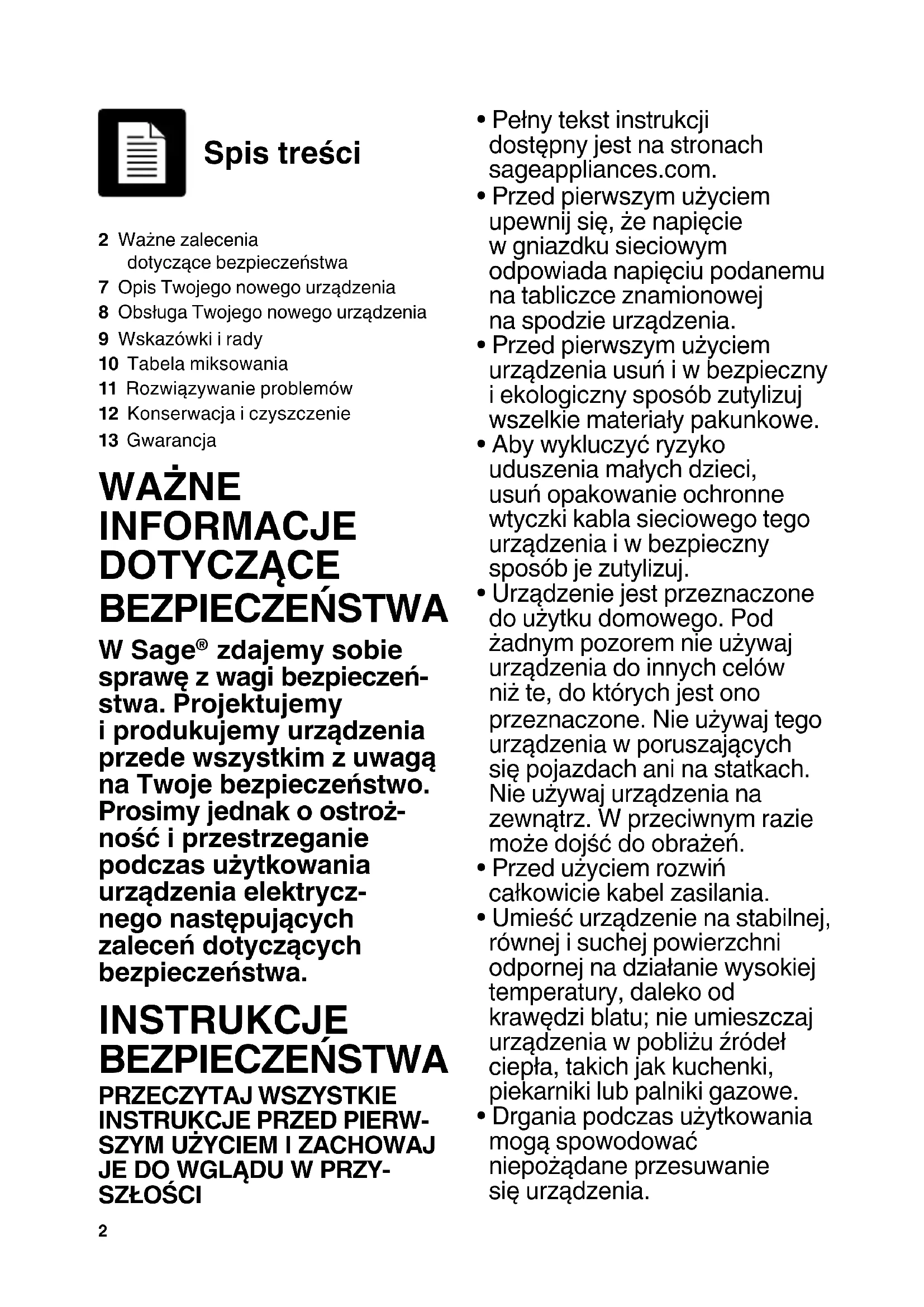 - Drgania podczas użytkowania mogą spowodować niepożądane przesuwanie się urządzenia. 2 Ważne zalecenia dotyczące bezpieczeństwa 7 Opis Twojego nowego urządzenia 8 Obsługa Twojego nowego urządzenia 9 Wskazówki i rady 10 Tabela miksowania 11 Rozwiązywanie problemów 12 Konserwacja i czyszczenie 13 Gwarancja WAŻNE INFORMACJE DOTYCZĄCE BEZPIECZEŃSTWA W Sage
