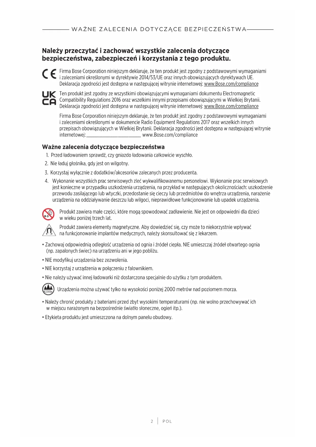 Firma Bose Corporation niniejszym deklaruje, że ten produkt jest zgodny z podstawowymi wymaganiami i zaleceniami określonymi w dokumencie Radio Equipment Regulations 2017 oraz wszelkich innych przepisach obowiązujących w Wielkiej Brytanii. Deklaracja zgodności jest dostępna w następującej witrynie internetowej: ____ www.Bose.com/compliance