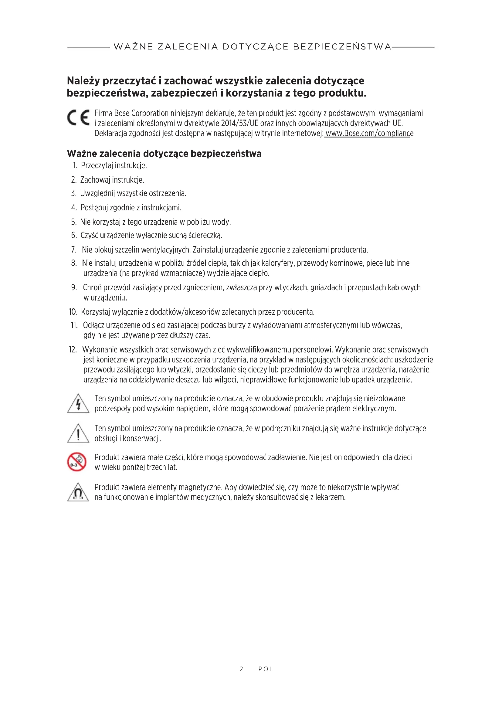 POL Należy przeczytać izachować wszystkie zalecenia dotyczące bezpieczeństwa, zabezpieczeń ikorzystania ztego produktu. Firma Bose Corporation niniejszym deklaruje, żeten produkt jest zgodny zpodstawowymi wymaganiami izaleceniami określonymi wdyrektywie 2014/53/UE oraz innych obowiązujących dyrektywachUE. Deklaracjazgodności jest dostępna wnastępującej witrynie internetowej: www.Bose.com/compliance Ważne zalecenia dotyczące bezpieczeństwa