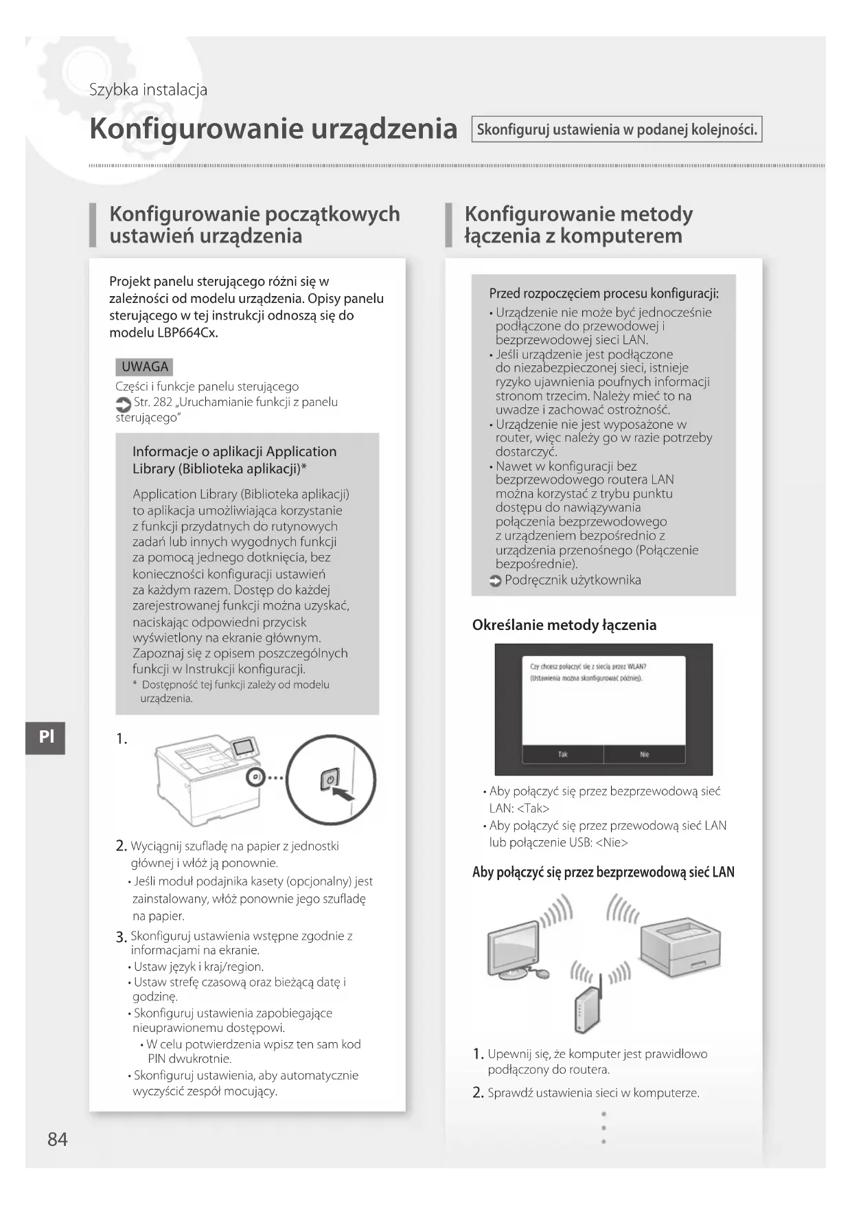 Wyciągnij szufladę na papier z jednostki głównej i włóż ją ponownie.•Jeślimodułpodajnikakasety(opcjonalny)jestzainstalowany, włóż ponownie jego szufladę na papier. Skonfiguruj ustawienia wstępne zgodnie z informacjami na ekranie.•Ustawjęzykikraj/region.•Ustawstrefęczasowąorazbieżącądatęigodzinę.•Skonfigurujustawieniazapobiegającenieuprawionemu dostępowi.•WcelupotwierdzeniawpisztensamkodPIN dwukrotnie.•Skonfigurujustawienia,abyautomatyczniewyczyścić zespół mocujący.Projekt panelu sterującego różni się w zależności od modelu urządzenia. Opisy panelu sterującego w tej instrukcji odnoszą się do modelu LBP664Cx.UWAGACzęści i funkcje panelu sterującego Str. 282 „Uruchamianie funkcji z panelu sterującego” Konfigurowanie początkowych ustawień urządzenia Przed rozpoczęciem procesu konfiguracji: