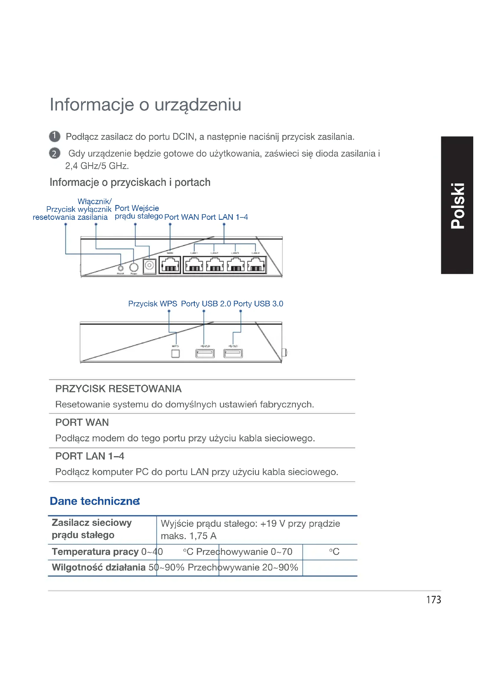 Gdy urządzenie będzie gotowe do użytkowania, zaświeci się dioda zasilania i 2,4GHz/5GHz. Informacje o urządzeniu Informacje o przyciskach i portach PRZYCISK RESETOWANIA Resetowanie systemu do domyślnych ustawień fabrycznych. PORT WAN Podłącz modem do tego portu przy użyciu kabla sieciowego. PORT LAN 1–4 Podłącz komputer PC do portu LAN przy użyciu kabla sieciowego. Przycisk WPSWłącznik/wyłącznik zasilaniaPort Wejście prądu stałegoPort WAN Port LAN 1–4Przycisk resetowaniaPorty USB 2.0 Porty USB 3.0 Zasilacz sieciowy prądu stałego Wyjście prądu stałego: +19 V przy prądzie maks. 1,75 A Temperatura pracy 0~40