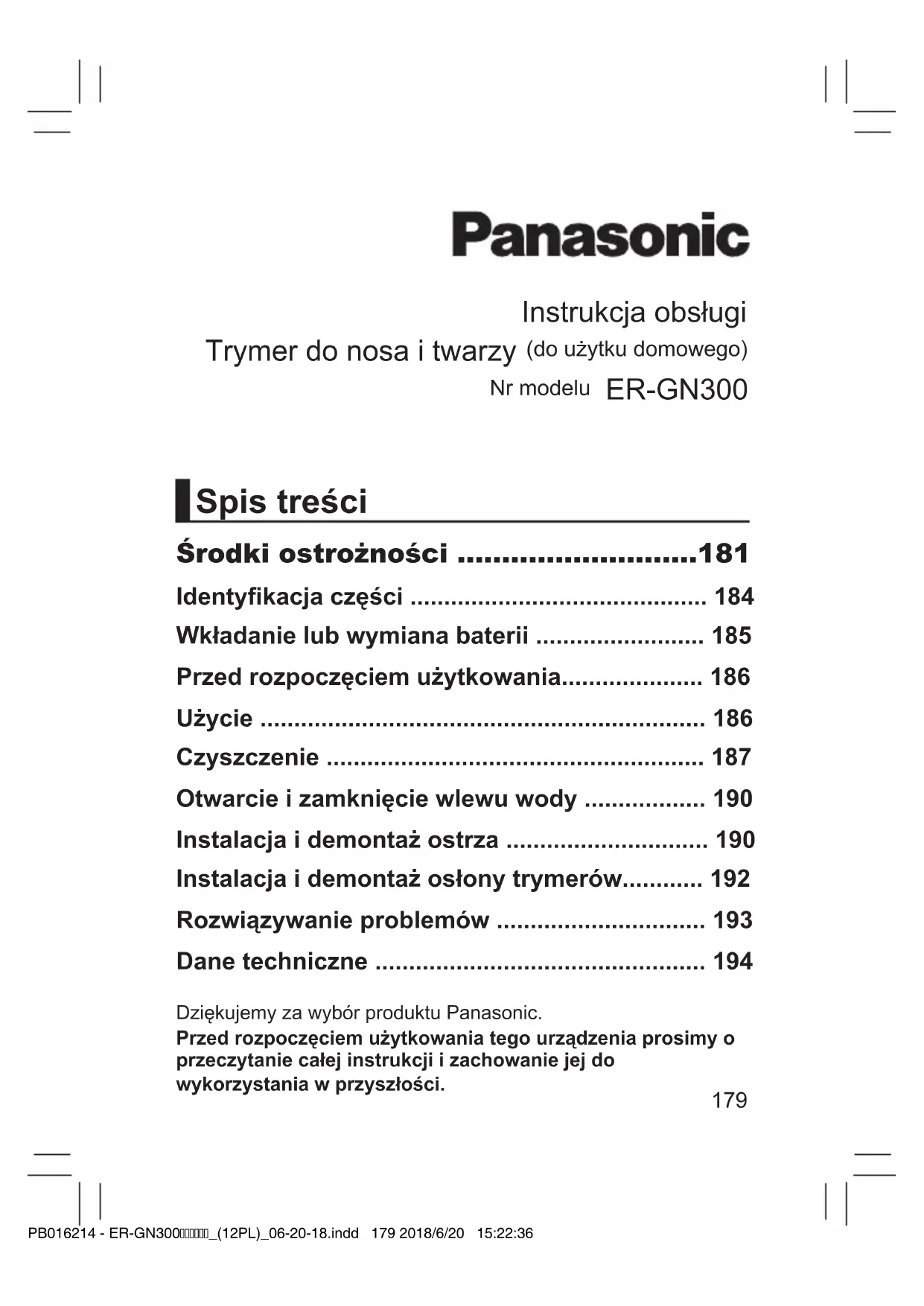 - Obróć pierścień przełączający czyszczenie, aż znak „ ” znajdzie się w jednej linii ze znakiem „ ” na korpusie. PB016214 - ER-GN300_(12PL)_06-20-18.indd 192 2018/6/20 15:22:40193 Rozwiązywanie problemów Problem Działanie Zmniejszona wydajność cięcia. Wymień ostrze. (Patrz strony 190~191) Wymień baterie alkaliczne. (Patrz strona 185) Oczyść wewnętrzne ostrze. (Patrz strony 188~189) Występuje dziwny zapach. Ostrza nie poruszają się/ obracają gładko. Niska moc ssania. Wyczyść osłonę trymerów. (Patrz strony 188~189). Zamknij wlew wody. (Patrz strony 186 i 190). Urządzenie nie jest włączone. Poprawnie włóż baterie. (Patrz strona 185). Wymień baterie alkaliczne. (Patrz strona 185). Jeśli ciągle nie jest możliwe rozwiązanie problemów, należy skontaktować się ze sklepem, w którym urządzenie zostało zakupione lub z autoryzowanym punktem serwisowym rmy Panasonic. PB016214 - ER-GN300_(12PL)_06-20-18.indd 193 2018/6/20 15:22:40194 Dane techniczne Zasilanie Suche ogniwo Typ baterii Dwie LR03 (Baterie alkaliczne AAA ) (sprzedawane oddzielnie) Poziom hałasu 58 (dB (A) re 1 pW) Ten produkt jest przeznaczony jedynie do użytku domowego. Pozbywanie się zużytych urządzeń elektrycznych i elektronicznych. Dotyczy wyłącznie obszaru Unii Europejskiej oraz krajów posiadających systemy zbiórki i recyklingu. Niniejszy symbol umieszczony na produktach, opakowaniach i/lub w dokumentacji towarzyszącej oznacza, że nie wolno mieszać zużytych urządzeń elektrycznych i elektronicznych z innymi odpadami domowymi/komunalnymi. W celu zapewnienia właściwego przetwarzania, utylizacji oraz recyklingu zużytych urządzeń elektrycznych i elektronicznych, należy oddawać je do wyznaczonych punktów gromadzenia odpadów zgodnie z przepisami prawa krajowego. Poprzez prawidłowe pozbywanie się zużytych urządzeń elektrycznych i elektronicznych pomagasz oszczędzać cenne zasoby naturalne oraz zapobiegać potencjalnemu negatywnemu wpływowi na zdrowie człowieka oraz na stan środowiska naturalnego. W celu uzyskania informacji o zbiórce oraz recyklingu zużytych urządzeń elektrycznych i elektronicznych prosimy o kontakt z władzami lokalnymi. Za niewłaściwe pozbywanie się tych odpadów mogą grozić kary przewidziane przepisami prawa krajowego. PB016214 - ER-GN300_(12PL)_06-20-18.indd 194 2018/6/20 15:22:40195 Děkujeme vám za zakoupení tohoto výrobku Panasonic.Před zahájením provozu tohoto přístroje si přečtěte všechny tyto pokyny a uložte je pro budoucí použití. Provozní pokyny Zastřihovač vousů a chloupků v nose (Domácí) Model č. ER-GN300 Obsah Bezpečnostní opatření .....................197 Identikace součástí .......................................... 200 Vkládání nebo výměna alkalických baterií ....... 201 Před použitím ...................................................... 201 Při použití ............................................................ 202 Čištění.................................................................. 203 Otevírání a zavírání přívodu vody ..................... 206 Nasazení nebo vyjmutí čepele........................... 206 Montáž nebo demontáž zásobníku na odstřižky .............................................................. 208 Řešení potíží ....................................................... 209 Specikace .......................................................... 210 PB016214 - ER-GN300_(13CZ)_06-20-18.indd 195 2018/6/20 15:22:05196 Varování