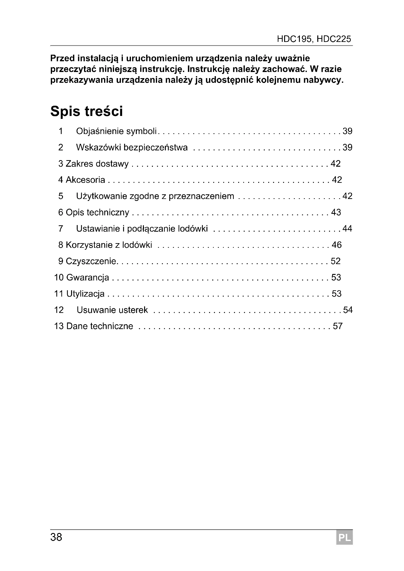 Jeżeli produkt nie będzie dłużej eksploatowany, koniecznie dowiedz się wnajbliższym zakładzie recyklingu lub w specjalistycznym sklepie, jakie są aktualnie obowiązujące przepisy dotyczące utylizacji. OSTRZEŻENIE! Uwaga na dzieci! Przed utylizacją zużytej lodówki: Zdemontować szufladę. Pozostawić półki w lodówce w taki sposób, aby dzieci nie mogły się po nich wspinać. UWAGA! W tym urządzeniu stosowany jest gaz izolujący (patrz tabliczka znamionowa). Należy skontaktować się z urzędem gminy lub lokalną firmą utylizacyjną w celu uzyskania informacji na temat prawidłowej utylizacji i upewnić się, czy urządzenie oraz wszyst- kie materiały zostaną poddane prawidłowej utylizacji.PL Usuwanie usterek HDC195, HDC225