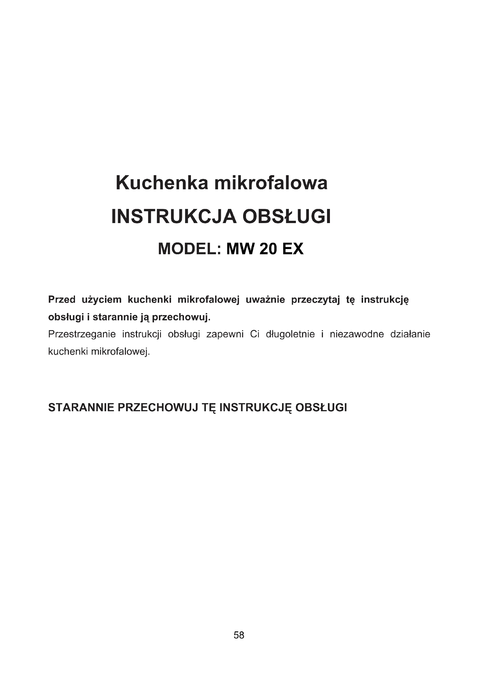 MODEL: MW 20 EX 58Dane techniczne Model: Napięcie znamionowe: 230V ~50Hz Moc znamionowa (kuchenki mikrofalowej): 1050 W Wyjściowa moc znamionowa (kuchenki mikrofalowej): 700 W Pojemność: 20 l Średnica talerza obrotowego: Ф255 mm Wymiary zewnętrzne: Waga netto: Ok. 10,71 kg MW 20 EX440 x 328 x 259 mm