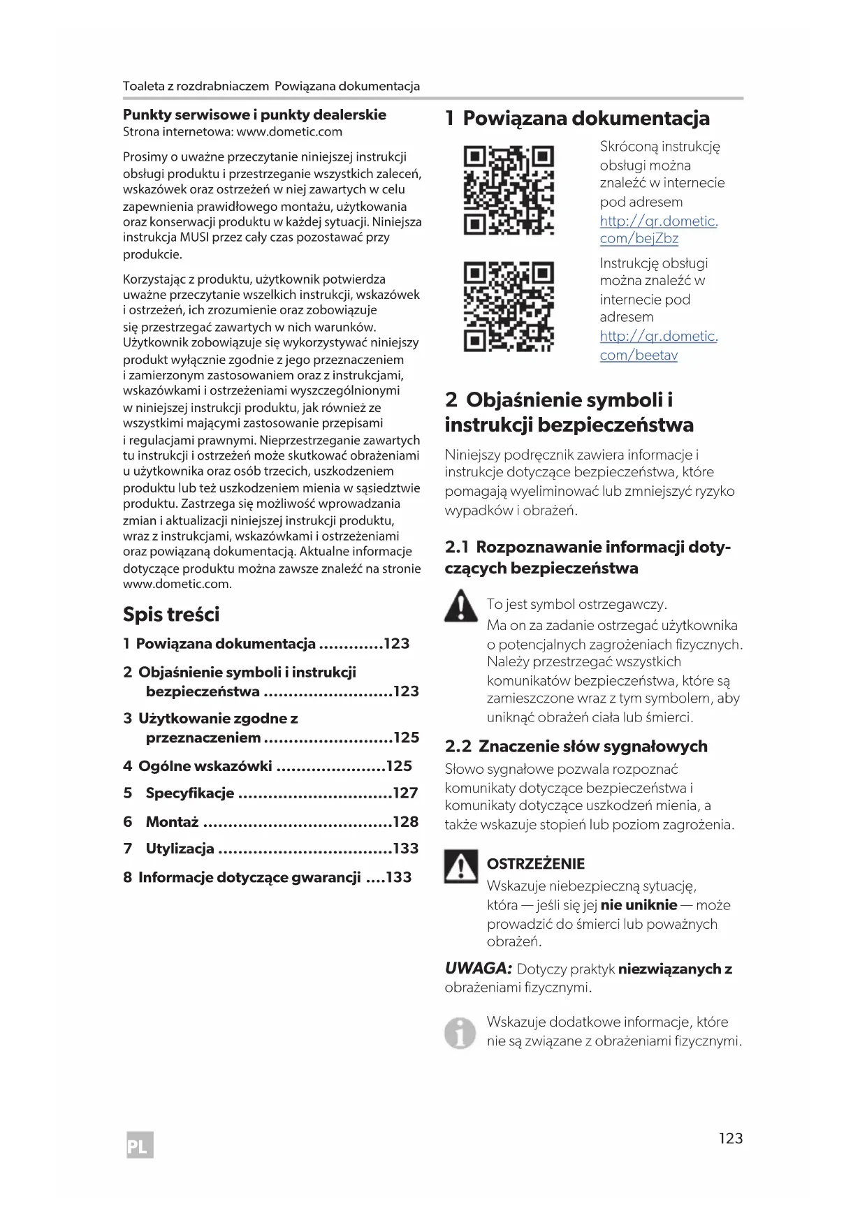 - 8 Informacje dotyczące gwarancji 1 Powiązana dokumentacja Skróconą instrukcję obsługi można znaleźć w internecie pod adresem http://qr.dometic. com/bejZbz Instrukcję obsługi można znaleźć w internecie pod adresem http://qr.dometic. com/beetav 2 Objaśnienie symboli i instrukcji bezpieczeństwa Niniejszy podręcznik zawiera informacje i instrukcje dotyczące bezpieczeństwa, które pomagają wyeliminować lub zmniejszyć ryzyko wypadków i obrażeń. p. 133