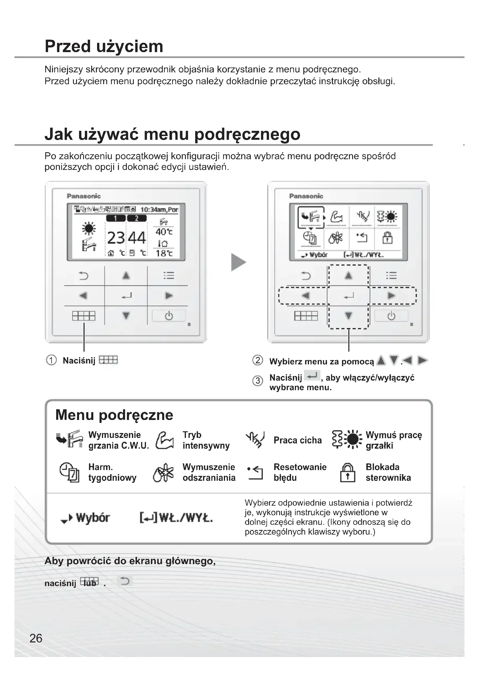 - Als “No” wordt geselecteerd, zal het scherm terugkeren naar het hoofdscherm. Ontgrendeling van de afstandsbediening Druk op een willekeurige knop. (Als de stand geactiveerd is, wordt het volgende scherm weergegeven.) Geef de 4 cijfers van het wachtwoord in (als het getal juist is, wordt het scherm ontgrendeld). Voor het resetten van vergeten wachtwoord (ook bij scherm UIT) Houd , en 5 seconden lang ingedrukt. (Als de stand geactiveerd is, wordt het volgende scherm weergegeven.) Selecteer “Reset”. (Het scherm gaat na 3 seconden uit.) Vergrendel R/C26 Niniejszy skrócony przewodnik objaśnia korzystanie z menu podręcznego. Przed użyciem menu podręcznego należy dokładnie przeczytać instrukcję obsługi. Przed użyciem Jak używać menu podręcznego Po zakończeniu początkowej konfi guracji można wybrać menu podręczne spośród poniższych opcji i dokonać edycji ustawień. Wybierz odpowiednie ustawienia i potwierdź je, wykonują instrukcje wyświetlone w dolnej części ekranu. (Ikony odnoszą się do poszczególnych klawiszy wyboru.) Menu podręczne Aby powrócić do ekranu głównego, naciśnij lub . Wymuszenie grzania C.W.U. Tryb intensywny Praca cicha Wymuś pracę grzałki Harm. tygodniowy Wymuszenie odszraniania Resetowanie błędu Blokada sterownika