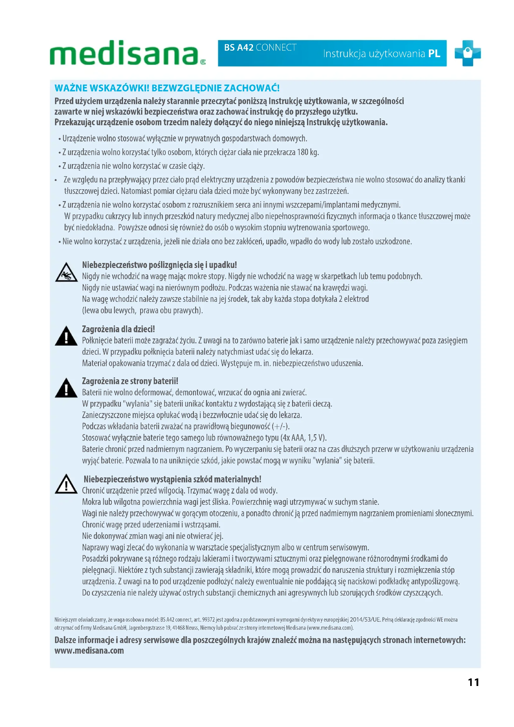 - Nie wolno korzystać z urządzenia, jeżeli nie działa ono bez zakłóceń, upadło, wpadło do wody lub zostało uszkodzone. Niebezpieczeństwo poślizgnięcia się i upadku! Nigdy nie wchodzić na wagę mając mokre stopy. Nigdy nie wchodzić na wagę w skarpetkach lub temu podobnych. Nigdy nie ustawiać wagi na nierównym podłożu. Podczas ważenia nie stawać na krawędzi wagi. Na wagę wchodzić należy zawsze stabilnie na jej środek, tak aby każda stopa dotykała 2 elektrod (lewa obu lewych, prawa obu prawych). Zagrożenia dla dzieci! Połknięcie baterii może zagrażać życiu. Z uwagi na to zarówno baterie jak i samo urządzenie należy przechowywać poza zasięgiem dzieci. W przypadku połknięcia baterii należy natychmiast udać się do lekarza. Materiał opakowania trzymać z dala od dzieci. Występuje m. in. niebezpieczeństwo uduszenia. Zagrożenia ze strony baterii! Baterii nie wolno deformować, demontować, wrzucać do ognia ani zwierać. W przypadku "wylania" się baterii unikać kontaktu z wydostającą się z baterii cieczą. Zanieczyszczone miejsca opłukać wodą i bezzwłocznie udać się do lekarza. Podczas wkładania baterii zważać na prawidłową biegunowość (+/-). Stosować wyłącznie baterie tego samego lub równoważnego typu (4x AAA, 1,5 V). Baterie chronić przed nadmiernym nagrzaniem. Po wyczerpaniu się baterii oraz na czas dłuższych przerw w użytkowaniu urządzenia wyjąć baterie. Pozwala to na uniknięcie szkód, jakie powstać mogą w wyniku "wylania" się baterii. Niebezpieczeństwo wystąpienia szkód materialnych! Chronić urządzenie przed wilgocią. Trzymać wagę z dala od wody. Mokra lub wilgotna powierzchnia wagi jest śliska. Powierzchnię wagi utrzymywać w suchym stanie. Wagi nie należy przechowywać w gorącym otoczeniu, a ponadto chronić ją przed nadmiernym nagrzaniem promieniami słonecznymi. Chronić wagę przed uderzeniami i wstrząsami. Nie dokonywać zmian wagi ani nie otwierać jej. Naprawy wagi zlecać do wykonania w warsztacie specjalistycznym albo w centrum serwisowym. Posadzki pokrywane są różnego rodzaju lakierami i tworzywami sztucznymi oraz pielęgnowane różnorodnymi środkami do pielęgnacji. Niektóre z tych substancji zawierają składniki, które mogą prowadzić do naruszenia struktury i rozmiękczenia stóp urządzenia. Z uwagi na to pod urządzenie podłożyć należy ewentualnie nie poddającą się naciskowi podkładkę antypoślizgową. Do czyszczenia nie należy używać ostrych substancji chemicznych ani agresywnych lub szorujących środków czyszczących. Niniejszym oświadczamy, że waga osobowa model: BS A42 connect, art. 99372 jest zgodna z podstawowymi wymogami dyrektywy europejskiej 2014/53/UE . Pełną deklarację zgodności WE można otrzymać od firmy Medisana GmbH, Jagenbergstrasse 19, 41468 Neuss, Niemcy lub pobrać ze strony internetowej Medisana (www.medisana.com). Dalsze informacje i adresy serwisowe dla poszczególnych krajów znaleźć można na następujących stronach internetowych: www.medisana.com12