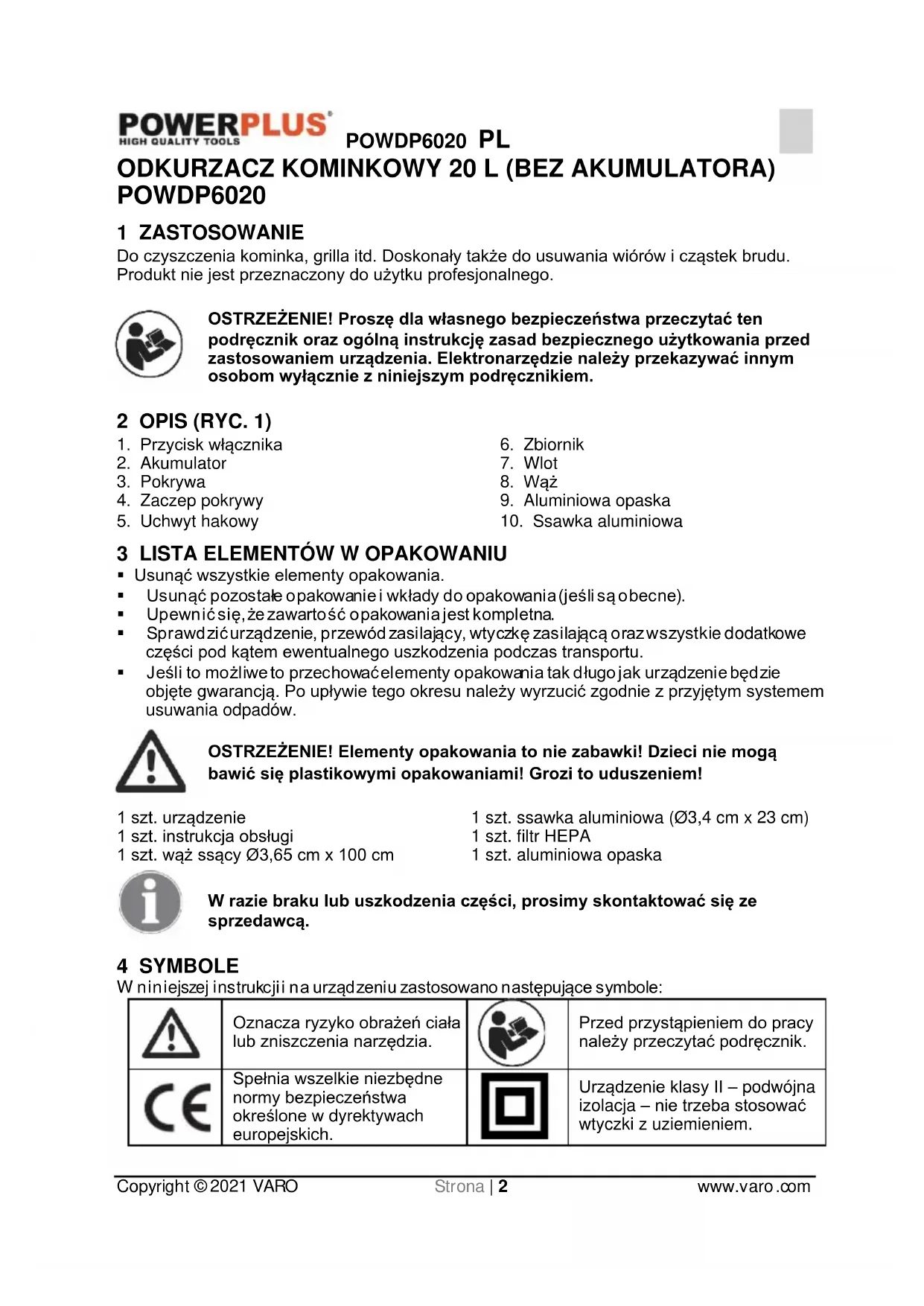 Copyright © 2021 VARO Strona | 2 www.varo.com ODKURZACZ KOMINKOWY 20 L (BEZ AKUMULATORA) POWDP6020 1 ZASTOSOWANIE Do czyszczenia kominka, grilla itd. Doskonały także do usuwania wiórów i cząstek brudu. Produkt nie jest przeznaczony do użytku profesjonalnego. OSTRZEŻENIE! Proszę dla własnego bezpieczeństwa przeczytać ten podręcznik oraz ogólną instrukcję zasad bezpiecznego użytkowania przed zastosowaniem urządzenia. Elektronarzędzie należy przekazywać innym osobom wyłącznie z niniejszym podręcznikiem. 2 OPIS (RYC. 1)