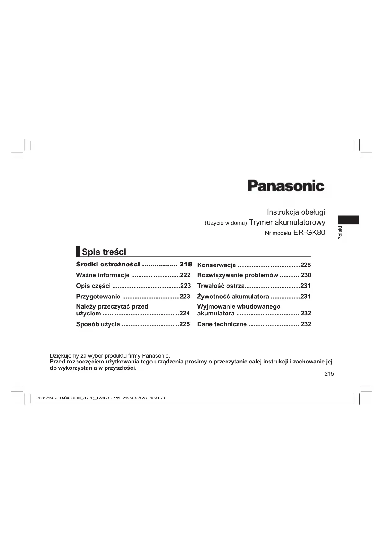 - Ochrona środowiska i recykling materiałów Trymer zawiera akumulator niklowo-metalowodorkowy. Upewnij się, że akumulator wyrzucany jest w wyznaczonym punkcie gromadzenia odpadów, jeżeli takie miejsce znajduje się w Twoim kraju. Dane techniczne Źródło zasilania Patrz tabliczka znamionowa na zasilaczu. (Automatyczna zmiana napięcia zasilania) Napięcie pracy silnika 1,2 V Czas ładowania Około 1 godziny Poziom hałasu 63 (dB (A) re 1 pW) Produkt przeznaczony wyłącznie do użytku domowego. PB017156 - ER-GK80_(12PL)_12-06-18.indd 232 2018/12/6 16:41:27233 Polski Pozbywanie się zużytych urządzeń elektrycznych i elektronicznych oraz baterii. Dotyczy wyłącznie obszaru Unii Europejskiej oraz krajów posiadających systemy zbiórki i recyklingu. Niniejsze symbole umieszczane na produktach, opakowaniach i/lub w dokumentacji towarzyszącej oznaczają, że nie wolno mieszać zużytych urządzeń elektrycznych i elektronicznych oraz baterii z innymi odpadami domowymi/komunalnymi. W celu zapewnienia właściwego przetwarzania, utylizacji oraz recyklingu zużytych urządzeń elektrycznych i elektronicznych oraz zużytych baterii, należy oddawać je do wyznaczonych punktów gromadzenia odpadów zgodnie z przepisami prawa krajowego. Poprzez prawidłowe pozbywanie się zużytych urządzeń elektrycznych i elektronicznych oraz zużytych baterii pomagasz oszczędzać cenne zasoby naturalne oraz zapobiegać potencjalnemu negatywnemu wpływowi na zdrowie człowieka oraz na stan środowiska naturalnego. W celu uzyskania informacji o zbiórce oraz recyklingu zużytych urządzeń elektrycznych i elektronicznych oraz baterii prosimy o kontakt z władzami lokalnymi. Za niewłaściwe pozbywanie się tych odpadów mogą grozić kary przewidziane przepisami prawa krajowego. Dotyczy symbolu baterii (symbol poniżej) Ten symbol może występować wraz z symbolem pierwiastka chemicznego. W takim przypadku wymagania Dyrektywy w sprawie określonego środka chemicznego są spełnione. PB017156 - ER-GK80_(12PL)_12-06-18.indd 233 2018/12/6 16:41:27234 PB017156 - ER-GK80_(12PL)_12-06-18.indd 234 2018/12/6 16:41:27235 Česky Provozní pokyny (Pro domácí použití) Dobíjecí tělový zastřihovač Model č. ER‑GK80 Děkujeme vám za zakoupení tohoto výrobku Panasonic. Před zahájením provozu tohoto přístroje si přečtěte všechny tyto pokyny a uložte je pro budoucí použití. Bezpečnostní opatření p. 238