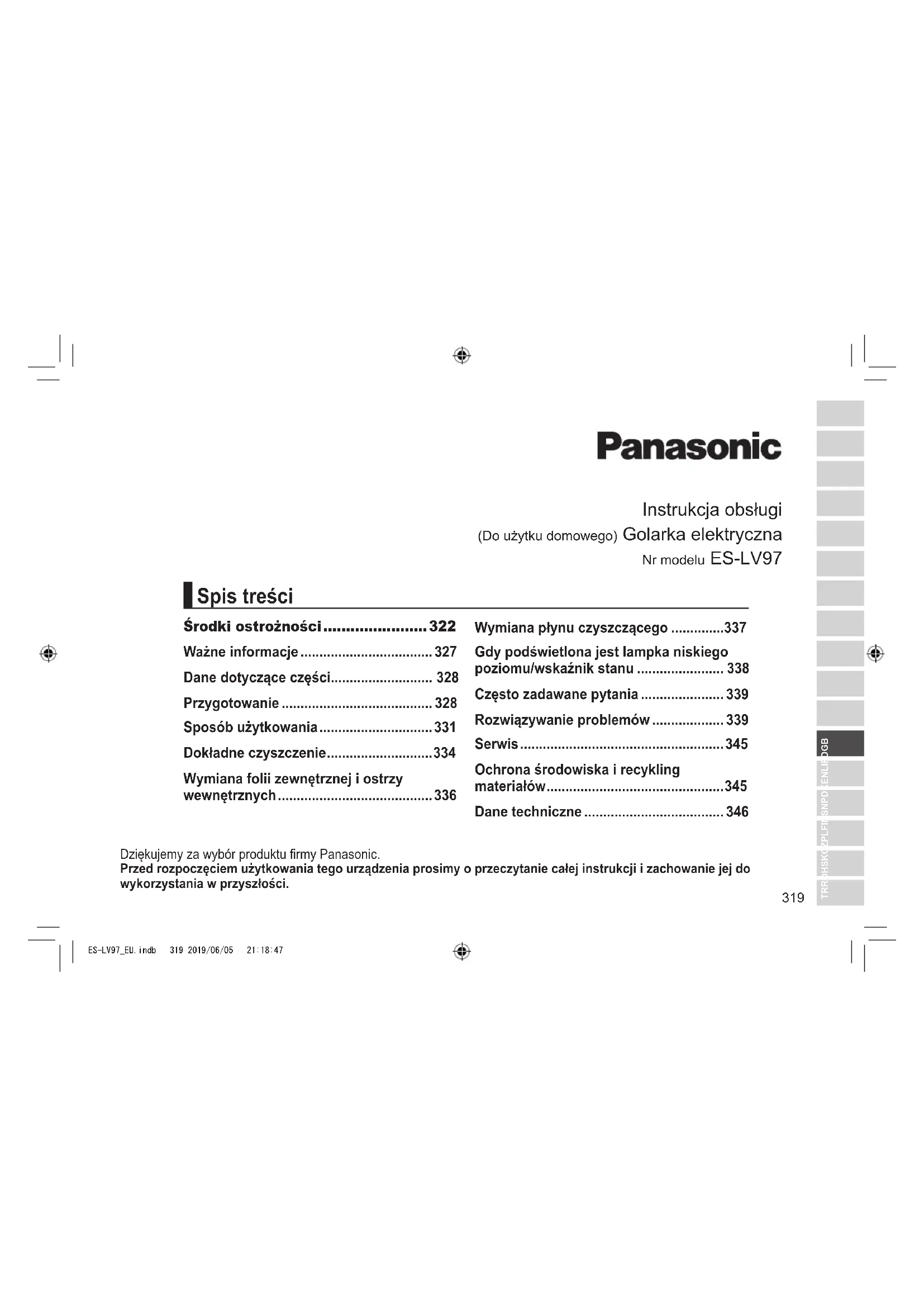 Tekniset tiedot Virtalähde Katso verkkolaitteen arvokilvestä. (automaattinen jännitteenvalinta) Moottorin jännite 3,6 V Latausaika Noin 1 tunti Ilmassa kantautuva melu parranajossa: 61 (dB (A) re 1 pW) rajaajan käytössä: 62 (dB (A) re 1 pW) Tämä tuote on tarkoitettu vain kotitalouskäyttöön. ES-LV97_EU.indb 318 2019/06/05 21:18:47319 TR RO H SK CZ PL FIN S N P DK E NL I F D GB Instrukcja obsługi (Do użytku domowego) Golarka elektryczna Nr modelu ES‑LV97 Dziękujemy za wybór produktu rmy Panasonic. Przed rozpoczęciem użytkowania tego urządzenia prosimy o przeczytanie całej instrukcji i zachowanie jej do wykorzystania w przyszłości. Środki ostrożności ....................... 322 Ważne informacje 327 Dane dotyczące części 328 Przygotowanie 328 Sposób użytkowania 331 Dokładne czyszczenie 334 Wymiana folii zewnętrznej i ostrzy wewnętrznych 336 Wymiana płynu czyszczącego 337 Gdy podświetlona jest lampka niskiego poziomu/wskaźnik stanu 338 Często zadawane pytania 339 Rozwiązywanie problemów 339 Serwis 345 Ochrona środowiska i recykling materiałów 345 Dane techniczne 346 Spis treści ES-LV97_EU.indb 319 2019/06/05 21:18:47320 Ostrzeżenie