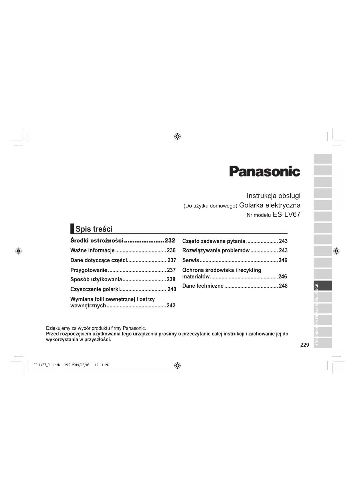 Tekniset tiedot Virtalähde Katso verkkolaitteen arvokilvestä. (automaattinen jännitteenvalinta) Moottorin jännite 3,6 V Latausaika Noin 1 tunti Ilmassa kantautuva melu parranajossa: 61 (dB (A) re 1 pW) rajaajan käytössä: 62 (dB (A) re 1 pW) Tämä tuote on tarkoitettu vain kotitalouskäyttöön. ES-LV67_EU.indb 228 2019/06/05 19:11:26229 TR RO H SK CZ PL FIN S N P DK E NL I F D GB Dziękujemy za wybór produktu rmy Panasonic. Przed rozpoczęciem użytkowania tego urządzenia prosimy o przeczytanie całej instrukcji i zachowanie jej do wykorzystania w przyszłości. Instrukcja obsługi (Do użytku domowego) Golarka elektryczna Nr modelu ES‑LV67 Środki ostrożności ....................... 232 Ważne informacje 236 Dane dotyczące części 237 Przygotowanie 237 Sposób użytkowania 238 Czyszczenie golarki 240 Wymiana folii zewnętrznej i ostrzy wewnętrznych 242 Często zadawane pytania 243 Rozwiązywanie problemów 243 Serwis 246 Ochrona środowiska i recykling materiałów 246 Dane techniczne 248 Spis treści ES-LV67_EU.indb 229 2019/06/05 19:11:26230 Ostrzeżenie