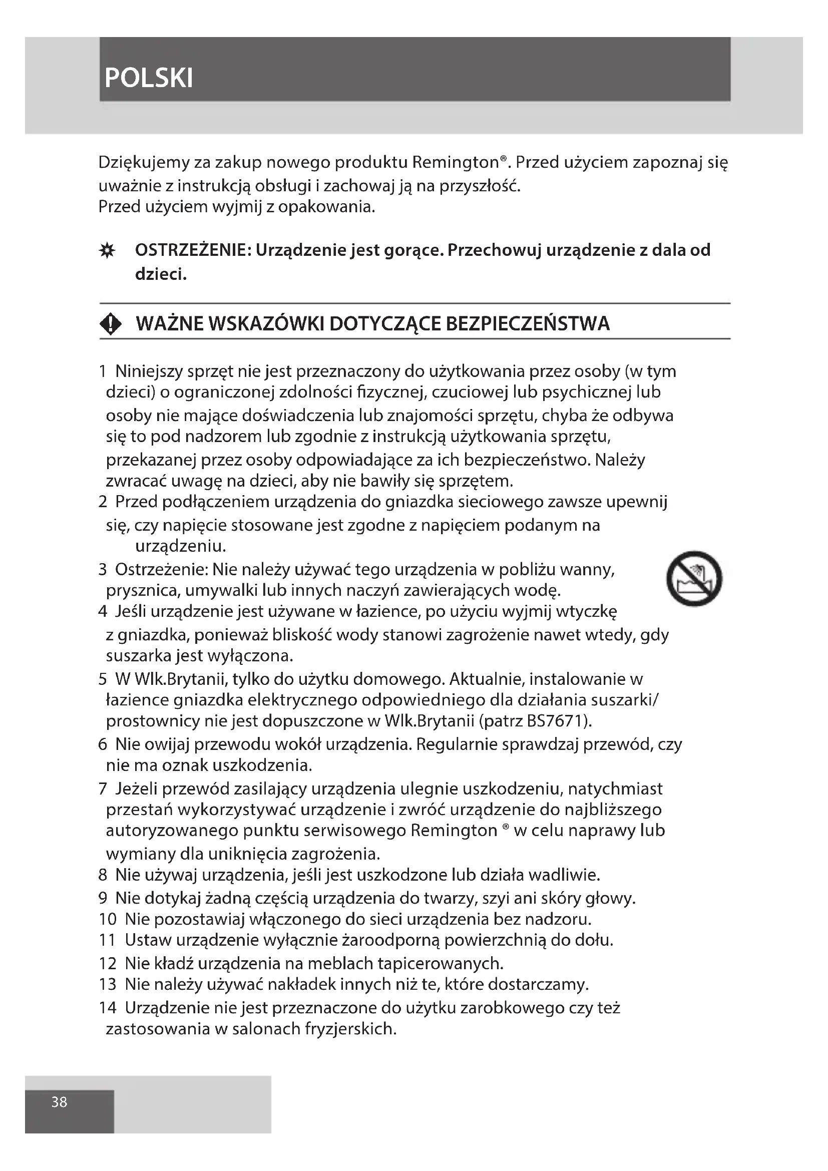 Aby nedošlo k ohrožení životního prostředí a zdraví vlivem nebezpečných látek obsažených v elektrických a elektronických produktech, nesmějí být přístroje označené tímto symbolem likvidovány jako směsný odpad, ale je nutno je třídit, znovu použít nebo recyklovat. ČESKY GBDNLFEIDKSFINPSKCZ HUN PLRUTRROGRSI AE HR UA38 Dziękujemy za zakup nowego produktu Remington®. Przed użyciem zapoznaj się uważnie z instrukcją obsługi i zachowaj ją na przyszłość. Przed użyciem wyjmij z opakowania. , OSTRZEŻENIE: Urządzenie jest gorące. Przechowuj urządzenie z dala od dzieci. F WAŻNE WSKAZÓWKI DOTYCZĄCE BEZPIECZEŃSTWA 1 Niniejszy sprzęt nie jest przeznaczony do użytkowania przez osoby (w tym dzieci) o ograniczonej zdolności zycznej, czuciowej lub psychicznej lub osoby nie mające doświadczenia lub znajomości sprzętu, chyba że odbywa się to pod nadzorem lub zgodnie z instrukcją użytkowania sprzętu, przekazanej przez osoby odpowiadające za ich bezpieczeństwo. Należy zwracać uwagę na dzieci, aby nie bawiły się sprzętem. 2 Przed podłączeniem urządzenia do gniazdka sieciowego zawsze upewnij się, czy napięcie stosowane jest zgodne z napięciem podanym na urządzeniu. 3 Ostrzeżenie: Nie należy używać tego urządzenia w pobliżu wanny, prysznica, umywalki lub innych naczyń zawierających wodę. 4 Jeśli urządzenie jest używane w łazience, po użyciu wyjmij wtyczkę z gniazdka, ponieważ bliskość wody stanowi zagrożenie nawet wtedy, gdy suszarka jest wyłączona. 5 W Wlk.Brytanii, tylko do użytku domowego. Aktualnie, instalowanie w łazience gniazdka elektrycznego odpowiedniego dla działania suszarki/ prostownicy nie jest dopuszczone w Wlk.Brytanii (patrz BS7671). 6 Nie owijaj przewodu wokół urządzenia. Regularnie sprawdzaj przewód, czy nie ma oznak uszkodzenia. 7 Jeżeli przewód zasilający urządzenia ulegnie uszkodzeniu, natychmiast przestań wykorzystywać urządzenie i zwróć urządzenie do najbliższego autoryzowanego punktu serwisowego Remington ® w celu naprawy lub wymiany dla uniknięcia zagrożenia. 8 Nie używaj urządzenia, jeśli jest uszkodzone lub działa wadliwie. 9 Nie dotykaj żadną częścią urządzenia do twarzy, szyi ani skóry głowy. 10 Nie pozostawiaj włączonego do sieci urządzenia bez nadzoru. 11 Ustaw urządzenie wyłącznie żaroodporną powierzchnią do dołu. 12 Nie kładź urządzenia na meblach tapicerowanych. 13 Nie należy używać nakładek innych niż te, które dostarczamy. 14 Urządzenie nie jest przeznaczone do użytku zarobkowego czy też zastosowania w salonach fryzjerskich. POLSKI39 15 Odczekać do ochłodzenia urządzenia, przed jego czyszczeniem i schowaniem.