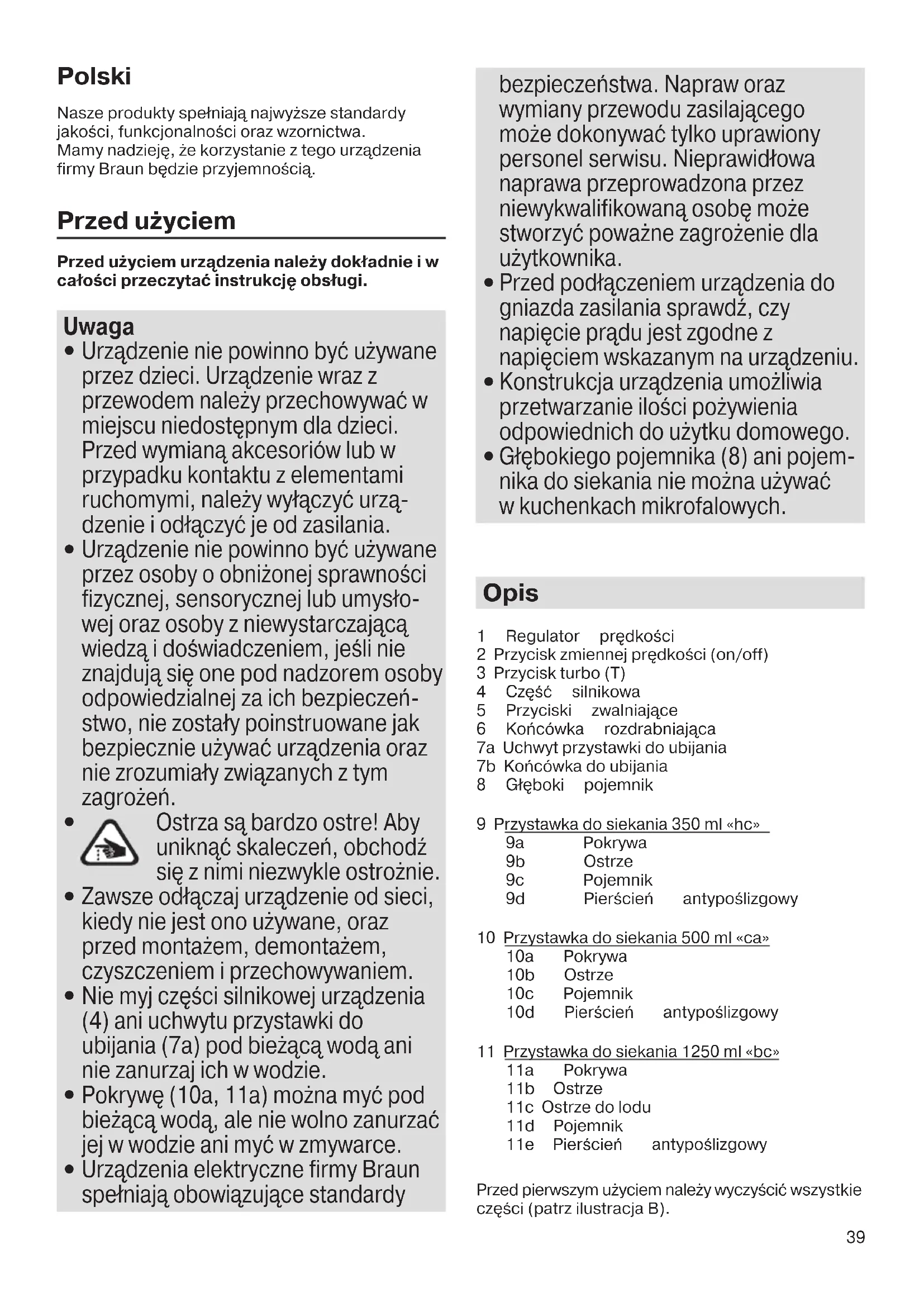 Urządzenia elektryczne firmy Braun spełniają obowiązujące standardy bezpieczeństwa. Napraw oraz wymiany przewodu zasilającego może dokonywać tylko uprawiony personel serwisu. Nieprawidłowa naprawa przeprowadzona przez niewykwalifikowaną osobę może stworzyć poważne zagrożenie dla użytkownika.