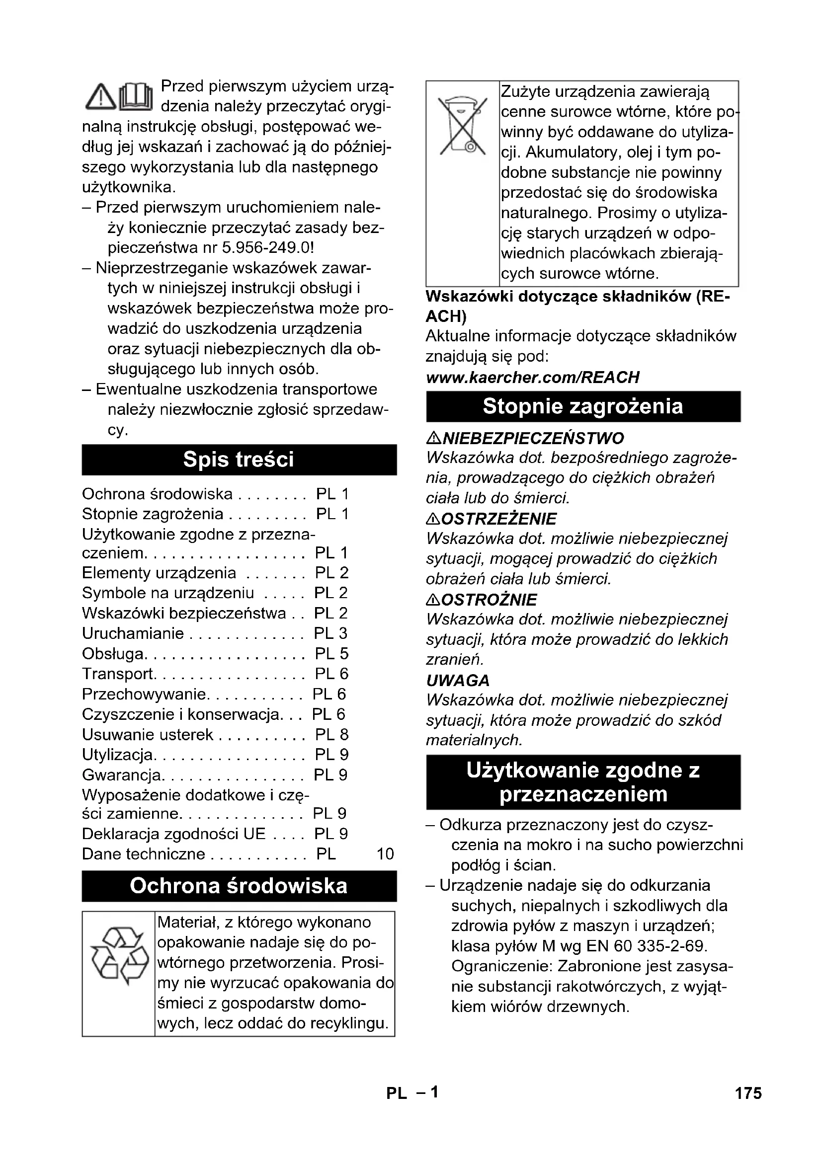 Št. delov Dolžina kabla EU 6.650-665.0 7,5 m GB 6.650-728.0 7,5 m CH 6.650-726.0 7,5 m AU 6.650-727.0 7,5 m 174 SL– 1 Przed pierwszym użyciem urzą- dzenia należy przeczytać orygi- nalną instrukcję obsługi, postępować we- dług jej wskazań i zachować ją do później- szego wykorzystania lub dla następnego użytkownika. – Przed pierwszym uruchomieniem nale- ży koniecznie przeczytać zasady bez- pieczeństwa nr 5.956-249.0! – Nieprzestrzeganie wskazówek zawar- tych w niniejszej instrukcji obsługi i wskazówek bezpieczeństwa może pro- wadzić do uszkodzenia urządzenia oraz sytuacji niebezpiecznych dla ob- sługującego lub innych osób. – Ewentualne uszkodzenia transportowe należy niezwłocznie zgłosić sprzedaw- cy. Wskazówki dotyczące składników (RE- ACH) Aktualne informacje dotyczące składników znajdują się pod: www.kaercher.com/REACH NIEBEZPIECZEŃSTWO Wskazówka dot. bezpośredniego zagroże- nia, prowadzącego do ciężkich obrażeń ciała lub do śmierci. 몇 OSTRZEŻENIE Wskazówka dot. możliwie niebezpiecznej sytuacji, mogącej prowadzić do ciężkich obrażeń ciała lub śmierci. 몇 OSTROŻNIE Wskazówka dot. możliwie niebezpiecznej sytuacji, która może prowadzić do lekkich zranień. UWAGA Wskazówka dot. możliwie niebezpiecznej sytuacji, która może prowadzić do szkód materialnych. – Odkurza przeznaczony jest do czysz- czenia na mokro i na sucho powierzchni podłóg i ścian. – Urządzenie nadaje się do odkurzania suchych, niepalnych i szkodliwych dla zdrowia pyłów z maszyn i urządzeń; klasa pyłów M wg EN 60 335-2-69. Ograniczenie: Zabronione jest zasysa- nie substancji rakotwórczych, z wyjąt- kiem wiórów drzewnych. Spis treści Ochrona środowiska . . . . . . . . PL 1 Stopnie zagrożenia . . . . . . . . . PL 1 Użytkowanie zgodne z przezna- czeniem. . . . . . . . . . . . . . . . . . PL 1 Elementy urządzenia . . . . . . . PL 2 Symbole na urządzeniu . . . . . PL 2 Wskazówki bezpieczeństwa . . PL 2 Uruchamianie . . . . . . . . . . . . . PL 3 Obsługa. . . . . . . . . . . . . . . . . . PL 5 Transport. . . . . . . . . . . . . . . . . PL 6 Przechowywanie. . . . . . . . . . . PL 6 Czyszczenie i konserwacja. . . PL 6 Usuwanie usterek . . . . . . . . . . PL 8 Utylizacja. . . . . . . . . . . . . . . . . PL 9 Gwarancja. . . . . . . . . . . . . . . . PL 9 Wyposażenie dodatkowe i czę- ści zamienne. . . . . . . . . . . . . . PL 9 Deklaracja zgodności UE . . . . PL 9 Dane techniczne . . . . . . . . . . . PL 10 Ochrona środowiska Materiał, z którego wykonano opakowanie nadaje się do po- wtórnego przetworzenia. Prosi- my nie wyrzucać opakowania do śmieci z gospodarstw domo- wych, lecz oddać do recyklingu. Zużyte urządzenia zawierają cenne surowce wtórne, które po- winny być oddawane do utyliza- cji. Akumulatory, olej i tym po- dobne substancje nie powinny przedostać się do środowiska naturalnego. Prosimy o utyliza- cję starych urządzeń w odpo- wiednich placówkach zbierają- cych surowce wtórne. Stopnie zagrożenia Użytkowanie zgodne z przeznaczeniem 175PL– 2 – Urządzenie przeznaczone jest do za- stosowania profesjonalnego, np. w ho- telach, szkołach, szpitalach, fabrykach, sklepach, biurach i pomieszczeniach wynajmowanych. 1 Elektrody 2 Króciec ssący 3 Wąż ssący 4 Hak do węża 5 Blokada pałąka przesuwnego (tylko NT 50/1) 6 Dysza szczelinowa 7 Wylot powietrza, powietrze robocze 8 Głowica ssąca 9 Ryglowanie głowicy ssącej 10 Uchwyt 11 Zbiornik na zanieczyszczenia 12 Kółko skrętne 13 Uchwyt 14 Wlot powietrza, powietrze chłodzące silnik 15 Korek zatyczkowy 16 Ssawka podłogowa 17 Rura ssąca 18 Ogranicznik na walizkę narzędziową 19 Nasuwka gumowa, przykręcana 20 Uchwyt mocujący 21 Pokrywa filtra 22 Uchwyt do noszenia 23 Regulator siły ssania (bezstopniowy) 24 Adapter narzędziowy 25 Pałąk przesuwny (tylko NT 50/1) 26 Pokrętło do regulacji średnicy wężyka do zasysania 27 Podziałka średnicy wężyka do zasysa- nia 28 Pokrętło do regulacji mocy ssania 29 Gniazdko 30 Uchwyt na dyszę podłogową 31 Wąż spustowy (tylko NT 50/1) 32 Uchwyt na rurę ssącą 33 Hak kablowy (tylko NT 50/1) 34 Krzywak 35 Kabel sieciowy 36 Uchwyt na krzywkę (tylko NT 30/1, NT 40/1) 37 Rama filtra 38 Płaski filtr falisty (PES) 39 Czyszczenie filtra 40 Tabliczka identyfikacyjna NIEBEZPIECZEŃSTWO – W przypadku odprowadzania powietrza z urządzenia do pomieszczenia w po- mieszczeniu musi być zapewniony wy- starczający wskaźnik wymiany powie- trza L. W celu zachowania wymaga- nych wartości granicznych strumień ob- jętości powietrza zwrotnego może wynosić maksymalnie 50% strumienia objętości powietrza świeżego (kubatura pomieszczenia V