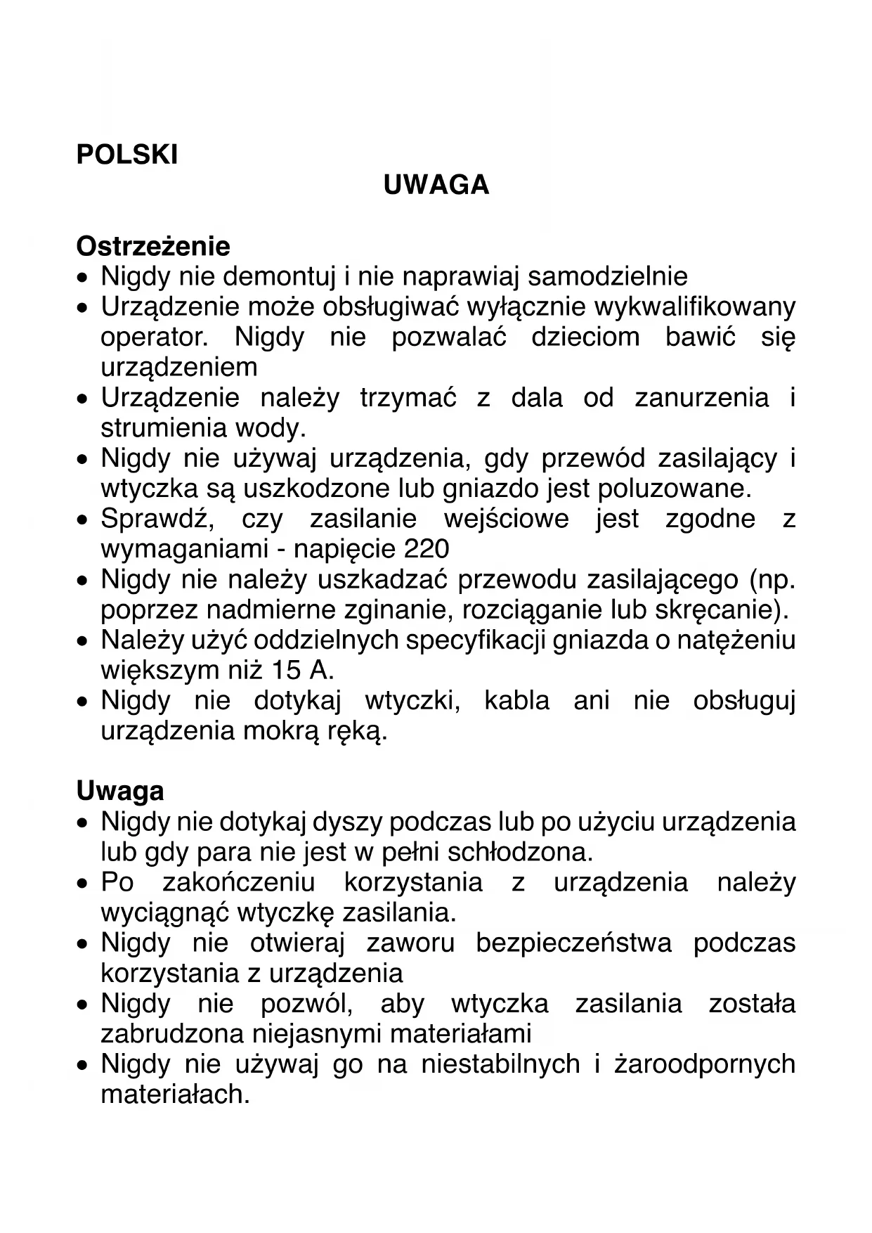 - Nigdy nie dotykaj dyszy podczas lub po użyciu urządzenia lub gdy para nie jest w pełni schłodzona.