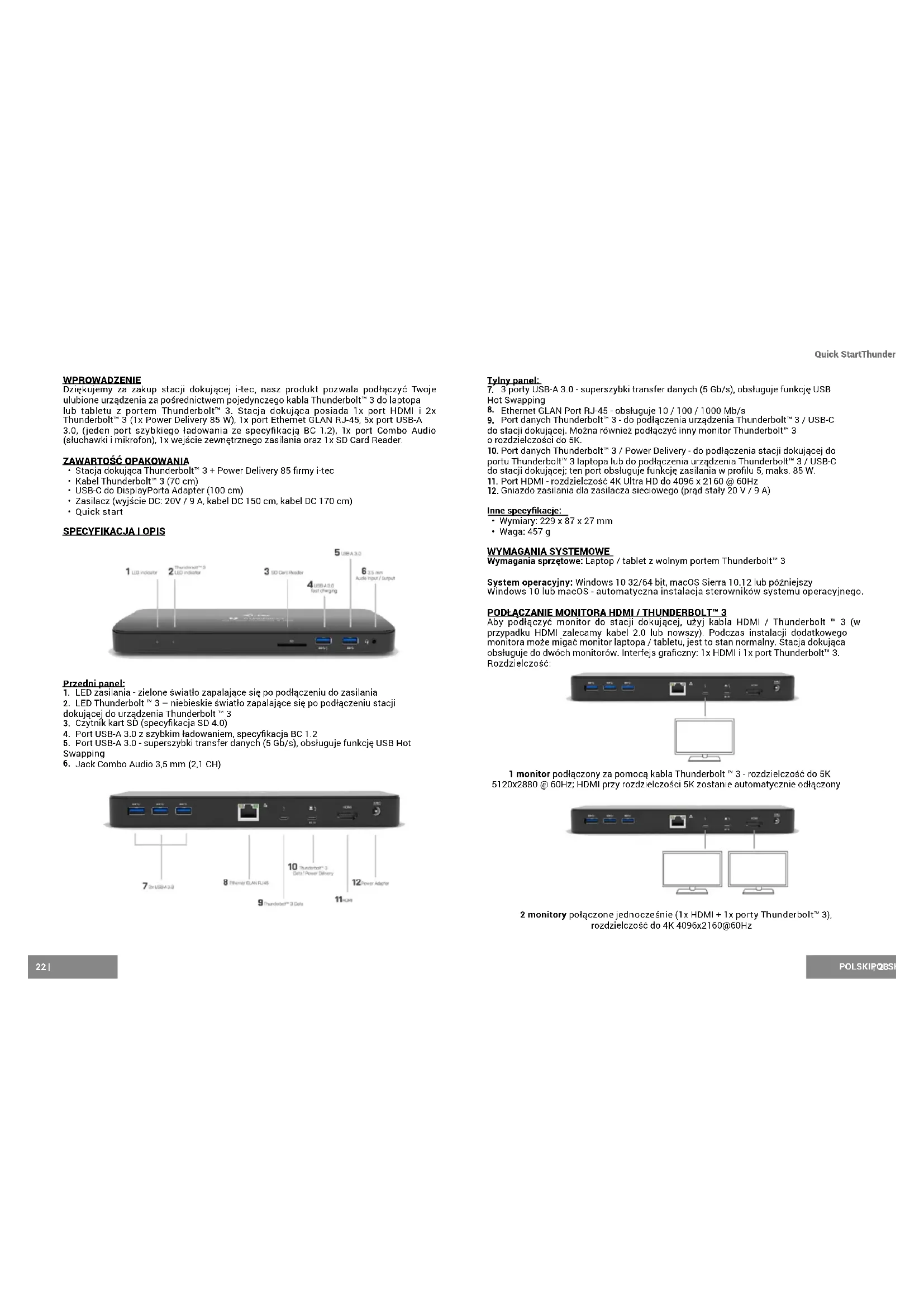 Quick StartThunderbolt™ 3 Docking Station + Power Delivery 180 W POLSKIPOLSKI WPROWADZENIE Dziękujemy za zakup stacji dokującej i-tec, nasz produkt pozwala podłączyć Twoje ulubione urządzenia za pośrednictwem pojedynczego kabla Thunderbolt™ 3 do laptopa lub tabletu z portem Thunderbolt™ 3. Stacja dokująca posiada 1x port HDMI i 2x Thunderbolt™ 3 (1x Power Delivery 85 W), 1x port Ethernet GLAN RJ-45, 5x port USB-A 3.0, (jeden port szybkiego ładowania ze specykacją BC 1.2), 1x port Combo Audio (słuchawki i mikrofon), 1x wejście zewnętrznego zasilania oraz 1x SD Card Reader. ZAWARTOŚĆ OPAKOWANIA