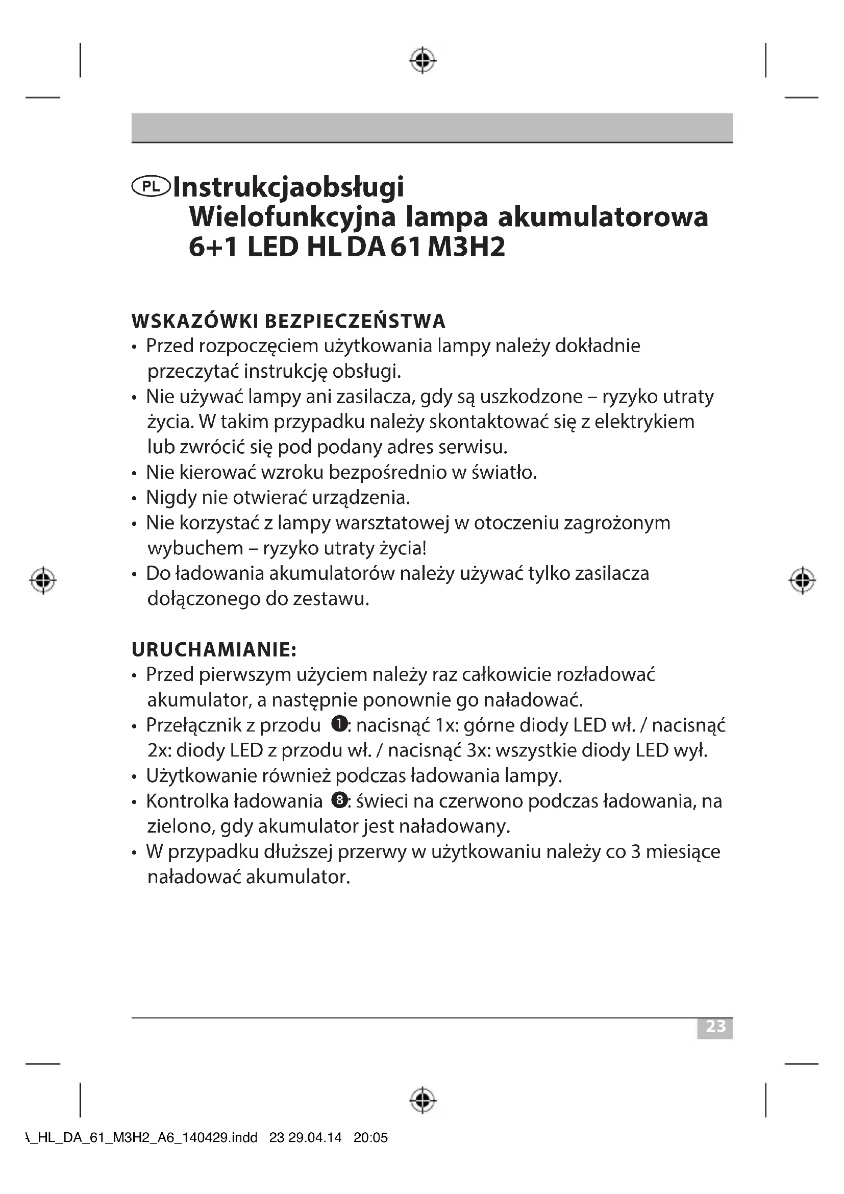 - W przypadku dłuższej przerwy w użytkowaniu należy co 3miesiące naładować akumulator. BA_HL_DA_61_M3H2_A6_140429.indd 23 29.04.14 20:0524