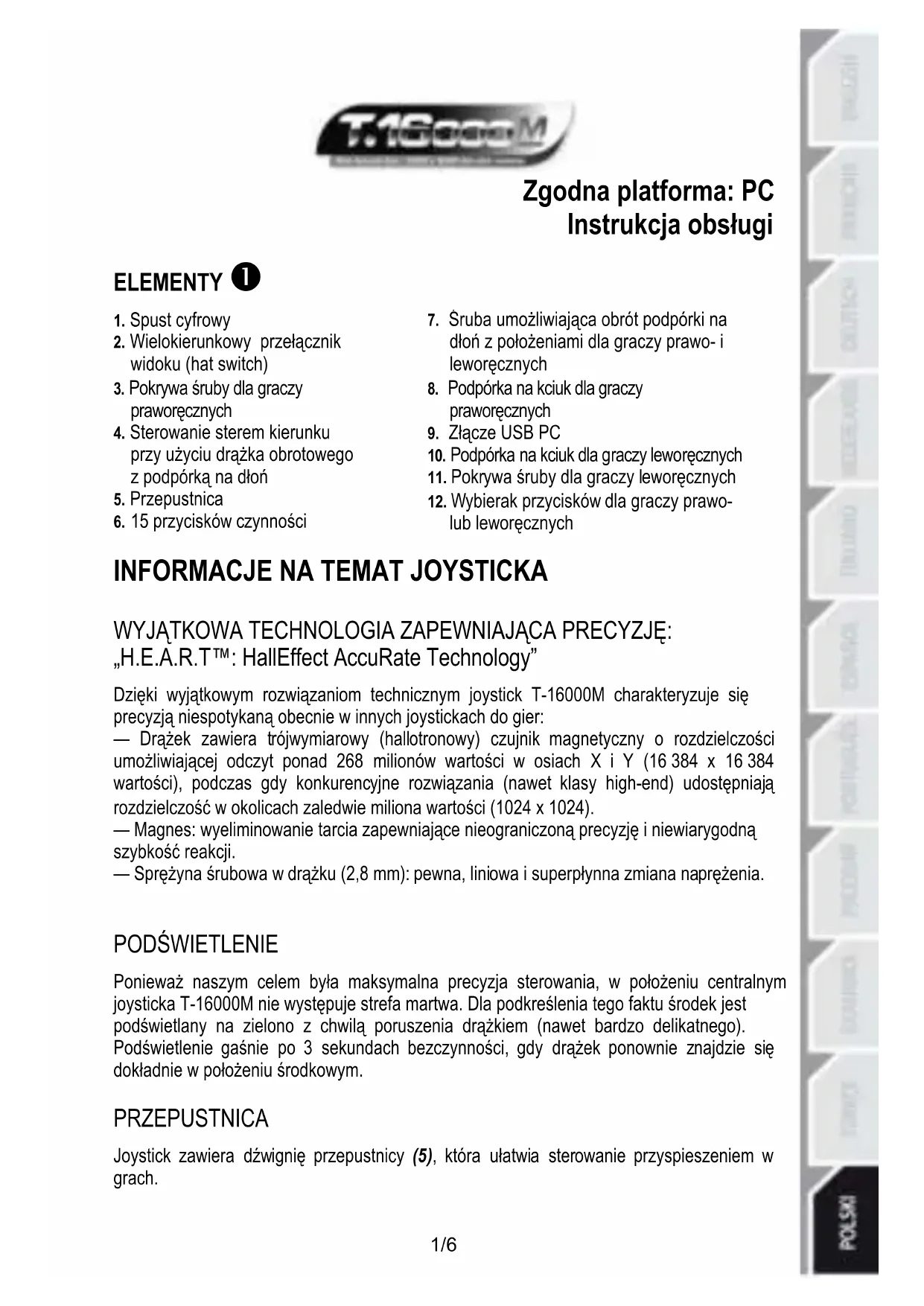WYJĄTKOWA TECHNOLOGIA ZAPEWNIAJĄCA PRECYZJĘ: „H.E.A.R.T™: HallEffect AccuRate Technology” Dzięki wyjątkowym rozwiązaniom technicznym joystick T-16000M charakteryzuje się precyzją niespotykaną obecnie w innych joystickach do gier: — Drążek zawiera trójwymiarowy (hallotronowy) czujnik magnetyczny o rozdzielczości umożliwiającej odczyt ponad 268 milionów wartości w osiach X i Y (16 384 x 16 384 wartości), podczas gdy konkurencyjne rozwiązania (nawet klasy high-end) udostępniają rozdzielczość w okolicach zaledwie miliona wartości (1024 x 1024). — Magnes: wyeliminowanie tarcia zapewniające nieograniczoną precyzję i niewiarygodną szybkość reakcji. — Sprężyna śrubowa w drążku (2,8 mm): pewna, liniowa i superpłynna zmiana naprężenia.