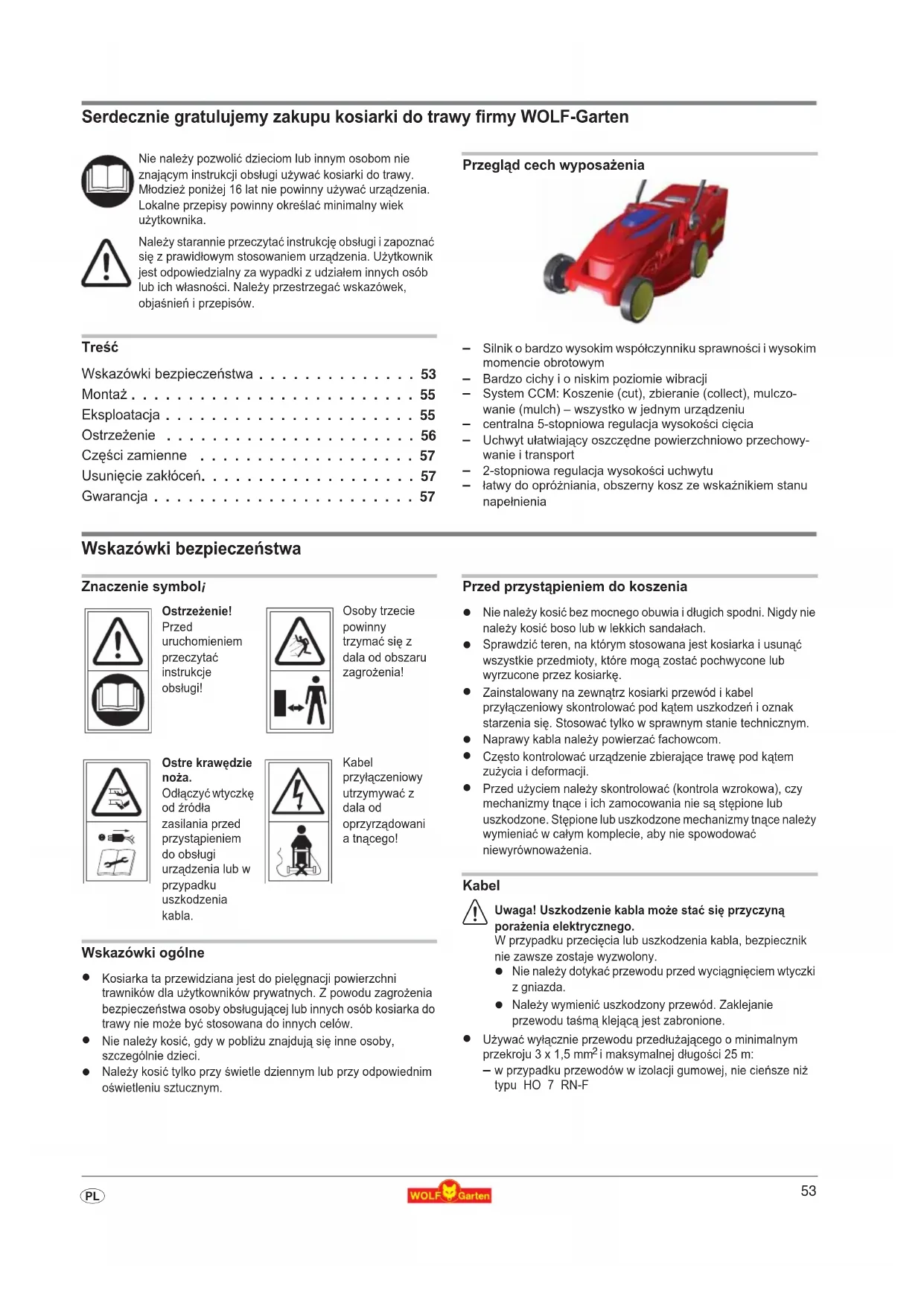 Serdecznie gratulujemy zakupu kosiarki do trawy firmy WOLF-Garten Tre Wskazówki bezpieczeËstwa