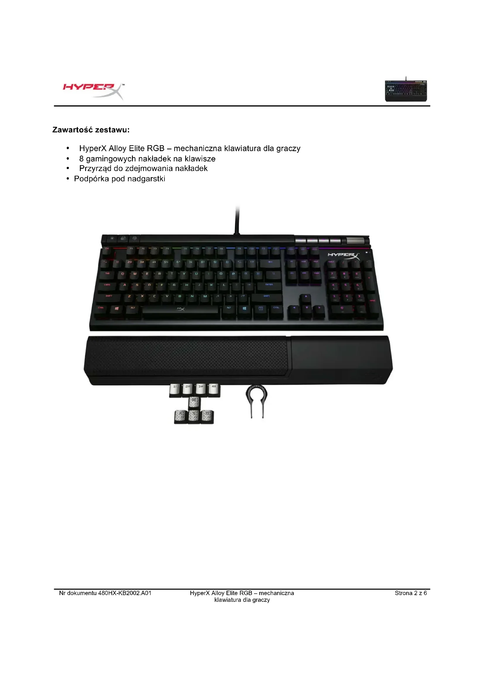 - Podpórka pod nadgarstkiNr dokumentu 480HX-KB2002.A01 HyperX Alloy Elite RGB – mechaniczna klawiatura dla graczy Strona 3 z 6