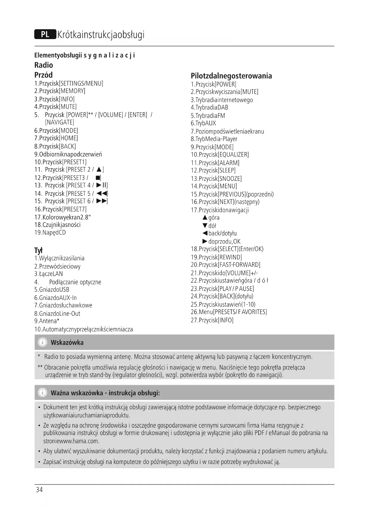 Wskazówka *Radio to posiada wymienną antenę.Można stosować antenę aktywną lub pasywną z łączem koncentrycznym. ** Obracanie pokrętłaumożliwia regulację głośności inawigację wmenu. Naciśnięcie tego pokrętłaprzełącza urządzenie wtryb stand-by (regulator głośności), wzgl. potwierdza wybór (pokrętłodonawigacji). Ważna wskazówka -instrukcja obsługi: