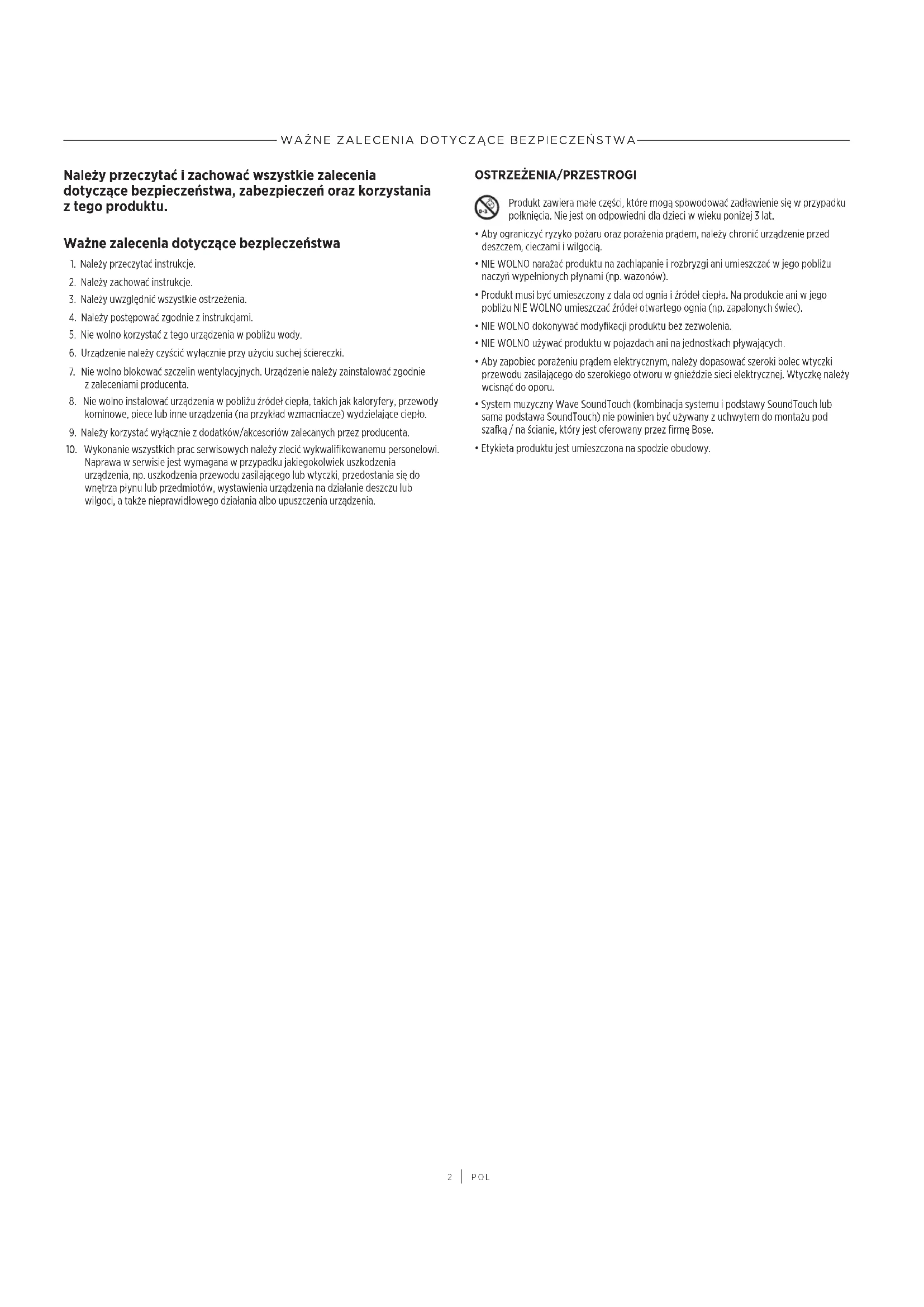- System muzyczny Wave SoundTouch (kombinacja systemu ipodstawy SoundTouch lub sama podstawa SoundTouch) nie powinien być używany zuchwytem do montażu pod szafką / na ścianie, który jest oferowany przez firmę Bose.