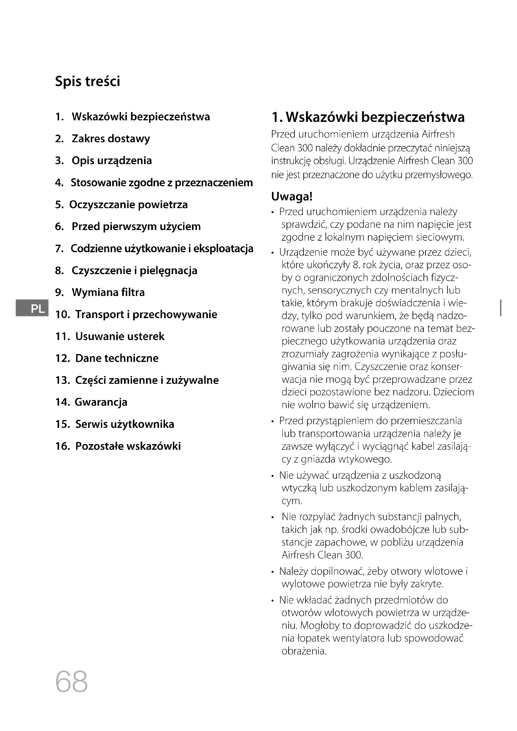 Przed uruchomieniem urządzenia Airfresh Clean 300 należy dokładnie przeczytać niniejszą instrukcję obsługi. Urządzenie Airfresh Clean 300 nie jest przeznaczone do użytku przemysłowego. Uwaga!