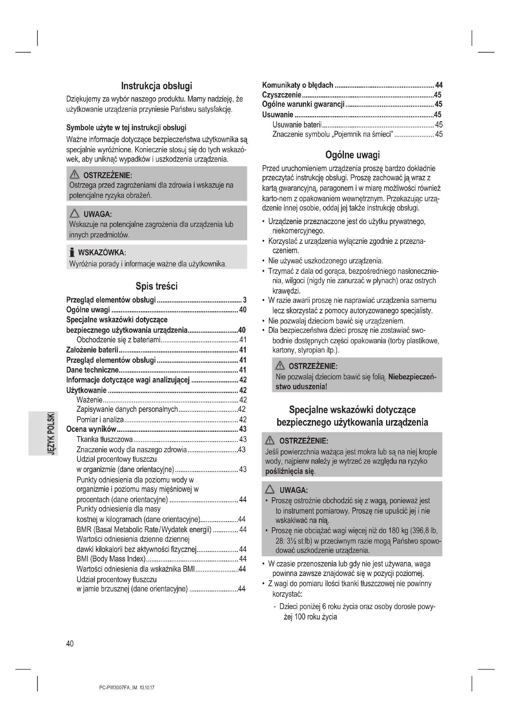 Uzyskane wyniki pomiarów ilości tkanki tłuszczowej i wody należy traktować wyłącznie jako wartości orientacyjne. Nie należy z nich korzystać do stawiania diagnozy lekarskiej. Chcąc poznać odpowiedzi na pytania dotyczące leczenia lub diety prowadzącej do uzyskania normalnej wagi ciała należy zasięgnąć porady lekarskiej.