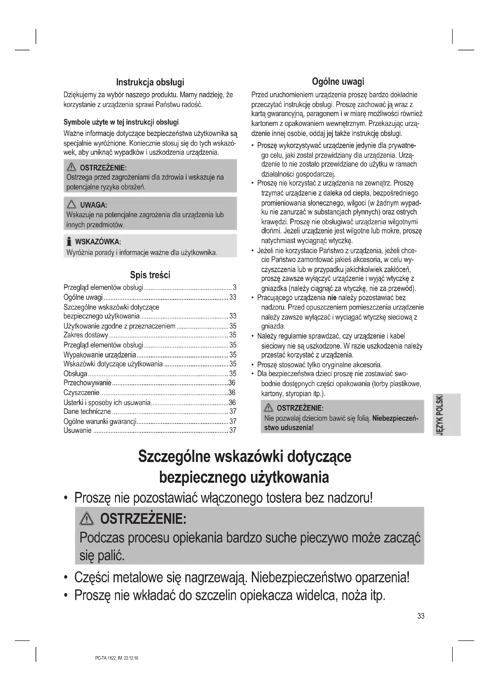 - Rusztu na bułki nie wolno przeciążać! Na ruszcie moż- na umieścić tylko jedną bułkę!36 PC-TA 1122_IM 23.12.16 UWAGA:
