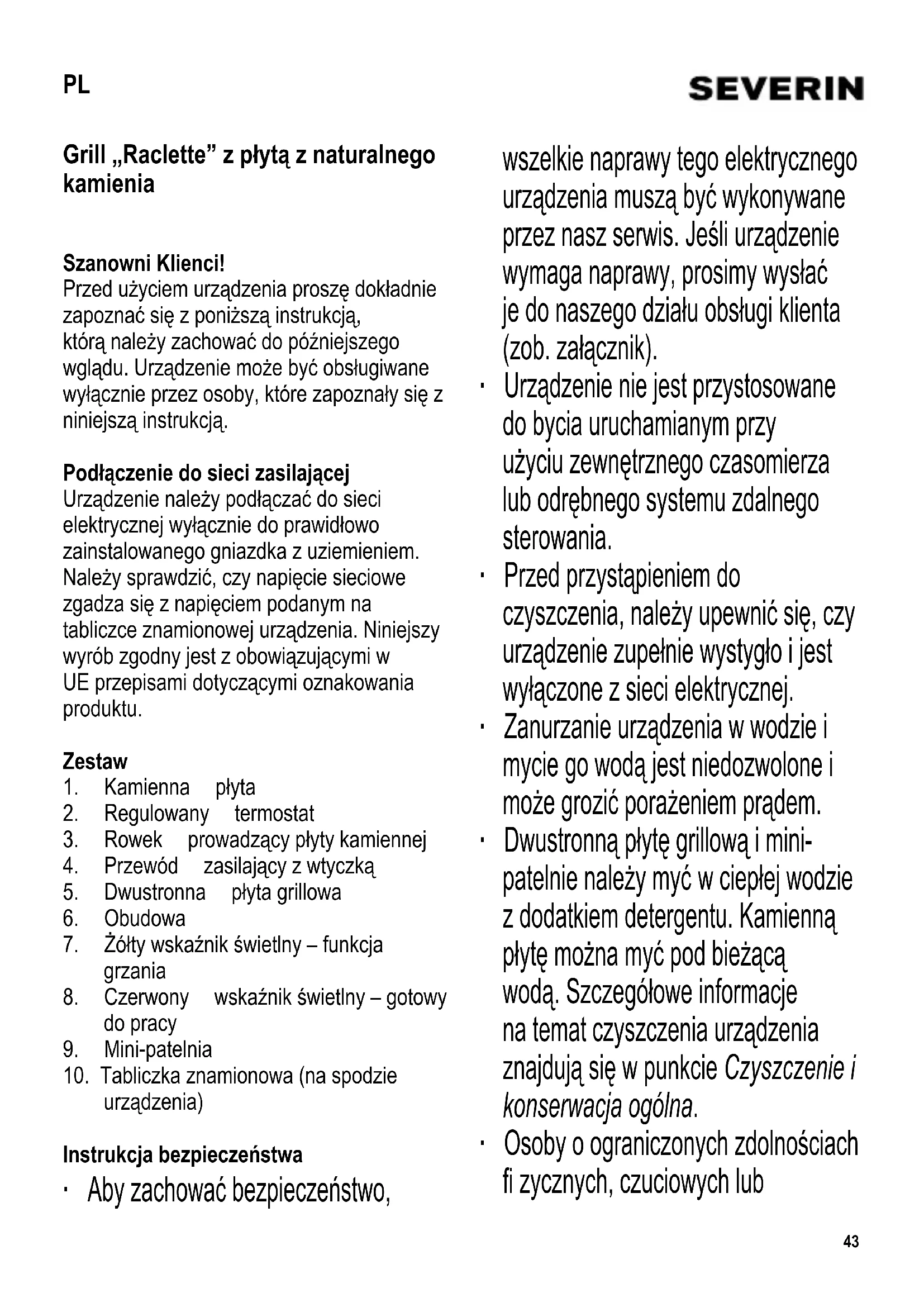 urządzenia) Instrukcja bezpieczeństwa ∙ Aby zachować bezpieczeństwo, wszelkie naprawy tego elektrycznego urządzenia muszą być wykonywane przez nasz serwis. Jeśli urządzenie wymaga naprawy, prosimy wysłać je do naszego działu obsługi klienta (zob. załącznik). ∙ Urządzenie nie jest przystosowane do bycia uruchamianym przy użyciu zewnętrznego czasomierza lub odrębnego systemu zdalnego sterowania. ∙ Przed przystąpieniem do czyszczenia, należy upewnić się, czy urządzenie zupełnie wystygło i jest wyłączone z sieci elektrycznej. ∙ Zanurzanie urządzenia w wodzie i mycie go wodą jest niedozwolone i może grozić porażeniem prądem. ∙ Dwustronną płytę grillową i mini- patelnie należy myć w ciepłej wodzie z dodatkiem detergentu. Kamienną płytę można myć pod bieżącą wodą. Szczegółowe informacje na temat czyszczenia urządzenia znajdują się w punkcie Czyszczenie i konserwacja ogólna. ∙ Osoby o ograniczonych zdolnościach fi zycznych, czuciowych lub PL44 psychicznych albo nieposiadające stosownego doświadczenia lub wiedzy, a także dzieci (w wieku co najmniej 8 lat), mogą korzystać z urządzenia, pod warunkiem że znajdują się pod nadzorem lub zostały poinstruowane, jak używać urządzenia i są w pełni świadome wszelkich zagrożeń i wymaganych środków ostrożności. ∙ Nie dopuszczać do używania urządzenia jako zabawki przez dzieci. ∙ Nie wolno pozwalać dzieciom na wykonywanie jakichkolwiek prac związanych bezpośrednio z konserwacją lub czyszczeniem urządzenia, a jeżeli już, to dziecko musi mieć co najmniej 8 lat i być nadzorowane przez osobę dorosłą. ∙ Nie dopuszczać do urządzenia i jego przewodu zasilają cego dzieci poniżej 8 lat. ∙ Uwaga: Nie pozwalać, aby dzieci miały dostęp do elementów opakowania, ponieważ mogą one spowodować zagrożenie, np. uduszenia. ∙ Przed użyciem należy dokładnie sprawdzić, czy główny korpus urządzenia i wszystkie elementy czynnościowe są sprawne i nie noszą śladów uszkodzenia. Jeżeli urządzenie np. spadło na twardą powierzchnię albo przewód zasilający został narażony na zbyt silne szarpnięcie, nie nadaje się ono do dalszego użytku: nawet najmniejsza, niewidoczna usterka powstała z tego powodu, może mieć ujemny wpływ na działanie urządzenia i bezpieczeństwo użytkownika. ∙ W trakcie pracy urządzenia jego powierzchnia, dwustronna płyta grillowa, płyta kamienna i mini-patelnie są gorące. Uwaga: dotknięcie grozi oparzeniem. ∙ Nie zostawiać włączonego urządzenia bez nadzoru. ∙ Przewód zasilający nie powinien zwisać swobodnie i należy uważać, aby znajdował się w bezpiecznej odległości od gorących elementów urządzenia. ∙ W czasie pracy urządzenie musi być umieszczone na powierzchni odpornej na wysokie temperatury, plamy i rozgrzany tłuszcz. Podczas opiekania żywności z dużą zawartością tłuszczu nie zawsze można uniknąć odprysków. ∙ Nie stawiać grilla w rogu ani nie opierać go o ścianę. Upewnić się, czy w pobliżu nie znajdują się żadne materiały łatwopalne. ∙ Przed uruchomieniem urządzenia na element grzejny należy najpierw nałożyć płytę grillową oraz płytę kamienną. ∙ Wtyczkę należy wyjąć z gniazda elektrycznego: - po zakończeniu pracy; - w przypadku stwierdzenia usterki urządzenia; - i przed przystąpieniem do czyszczenia. ∙ Wyjmując wtyczkę z gniazdka nigdy nie należy szarpać za przewód. ∙ Za szkody wynikłe z nieprawidłowego45 używania sprzętu lub użytkowania niezgodnego z instrukcją obsługi winę ponosi wyłącznie użytkownik. ∙ Urządzenie przeznaczone jest do zastosowań domowych lub podobnych, jak np. w - biurach lub innych miejscach pracy; - agroturystyce; - hotelach, motelach itp. oraz innych podobnych lokalach (przez klientów); - pensjonatach. Instrukcja używania grilla Przed pierwszym użyciem ∙ Zdjąć wszystkie elementy opakowania. ∙ Przed pierwszym użyciem urządzenia wyczyścić dwustronną płytę grillową, płytę kamienną i mini-patelnie przy użyciu wilgotnej ściereczki. ∙ W łączyć urządzenie z włożonymi mini- patelniami na około 10 minut bez ż ywności w celu pozbycia się specyfi cznego zapachu, jaki pojawia się przy pierwszym włączeniu grilla (może się też pojawić nieco dymu). Z tego względu należy zapewnić w pomieszczeniu odpowiednią wentylację, otwierając okna lub drzwi balkonowe. ∙ Wyczyścić następnie urządzenie zgodnie z instrukcją zamieszczoną w punkcie Czyszczenie i konserwacja. Kamienna płyta ∙ Położyć kamienną płytę na elemencie grzewczym gładką stroną do góry. Uwaga: nie należy kłaść zimnej płyty na gorącym elemencie grzewczym. ∙ Kamienną płytę można używać do pieczenia/smażenia warzyw, plasterków mięsa, ryb itp. ∙ Płyta kamienna wykonana jest z naturalnego materiału. Niewielkie pęknięcia wynikające z naturalnego rozkurczania i skurczania się płyty podczas ogrzewania i stygnięcia urządzenia są zjawiskiem normalnym, podobnie jak zmiana barwy na ciemniejszą. Nie ma to negatywnego wpływu na pracę urządzenia. ∙ Na płycie kamiennej nie należy umieszczać zamrożonej żywności ani produktów zawierających cukier (jak np. korniszony czy musztarda). Dwustronna płyta grillowa ∙ Położyć płytę na urządzeniu nad elementem grzewczym. ∙ Kiedy płyta jest odwrócona żeberkowaną stron ą do góry, można jej używać do normalnego grillowania. Przed użyciem płytę grillową należy posmarować niewielką ilością tłuszczu. Druga strona przeznaczona jest do smażenia 4 małych naleśników. Regulowany termostat ze wskaźnikiem świetlnym Jeżeli suwak termostatu jest ustawiony na najwyższą moc (prawy koniec), element grzewczy będzie włączony przez większą cześć czasu. Jeżeli suwak termostatu będzie ustawiony na niższą moc (po lewej stronie), element grzewczy będzie się od czasu do czasu wyłączać i pono